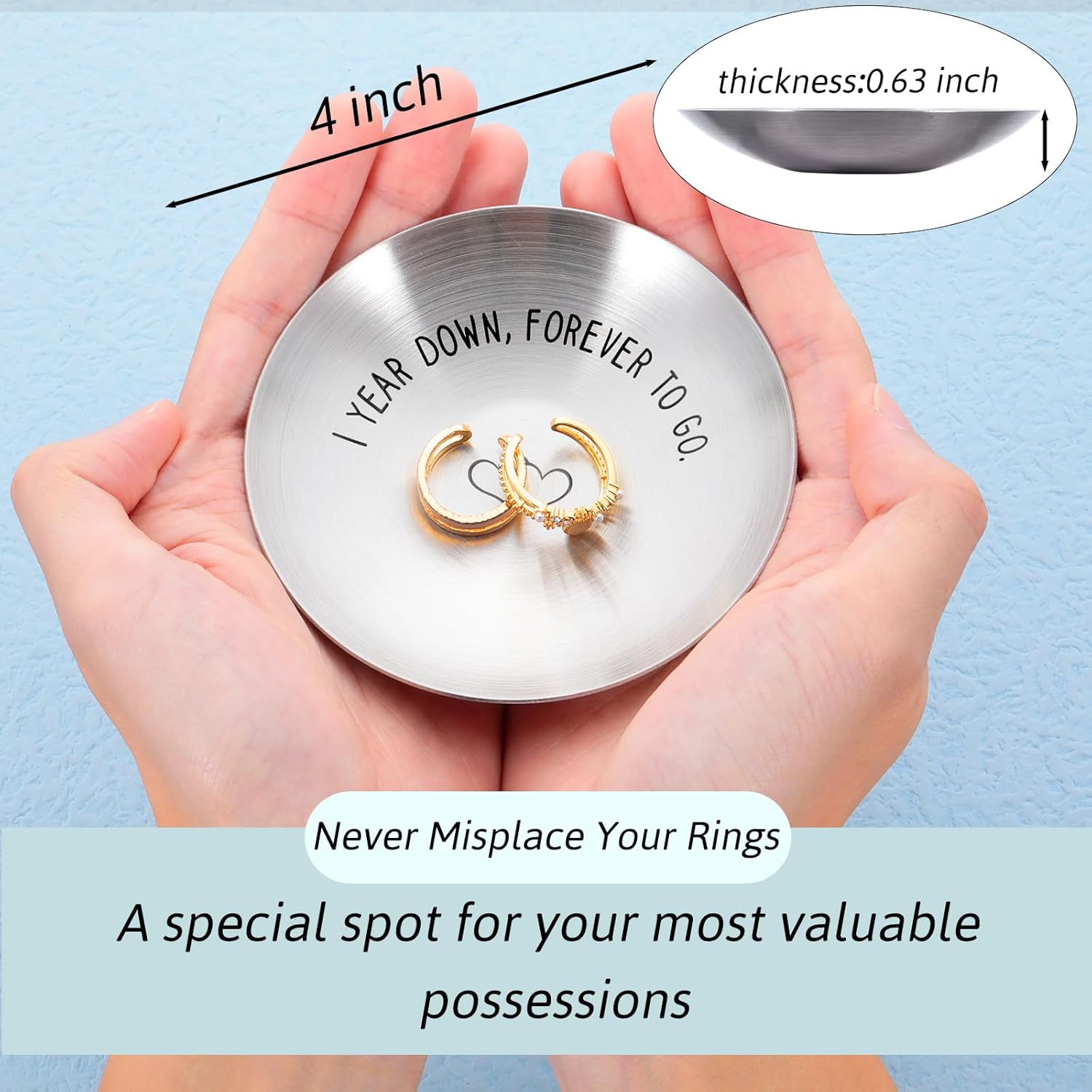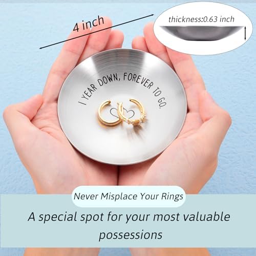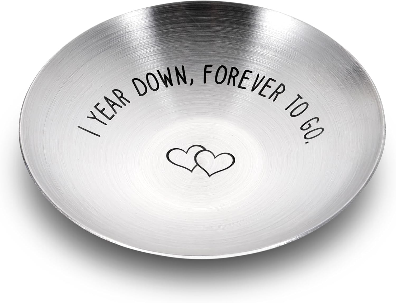 • ❤Anniversary Wedding Gifts for Couple❤Steel represents the strength and resilience of a marriage. This anniversary gifts for him her jewelry dish is made of stainless steel and engraved with “1 Years Down, Forever To Go”, strong and durable, just like your 1 years of marriage. Best one year anniversary gifts for your husband/ wife, boyfriend/girlfriend to celebrate your 1st wedding anniversary. Great 1 year anniversary gifts for him her, perfect traditional gift for your 1 year anniversary.