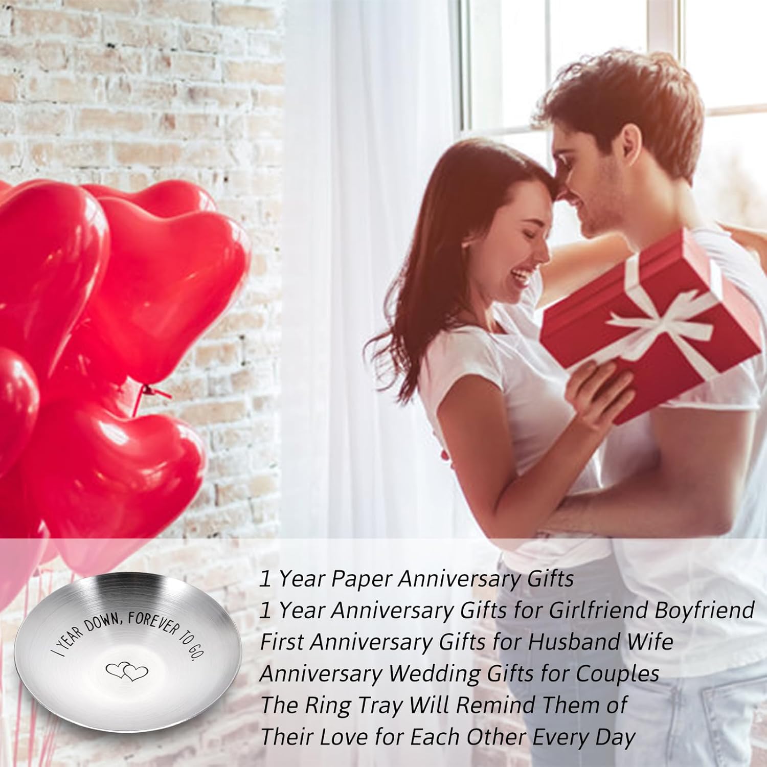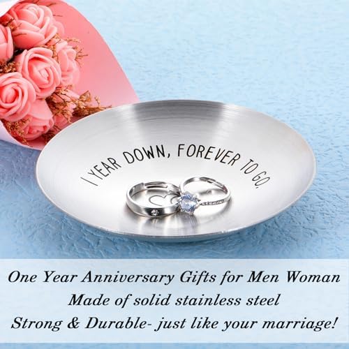 • ❤1 Year Anniversary Gifts for Him Her❤One Years Down, Forever To Go. 1 Year of love and commitment is a milestone worth celebrating Celebrate your iron anniversary with an engraved, stainless steel jewelry dish that will last as long as your marriage. Thoughtful 1 year wedding anniversary gift for husband/ wife/ boyfriend/ girlfriend/ man/ guy may be touched to tears when he/she see the sentimental from you and will surly remind him/her of your love every day.