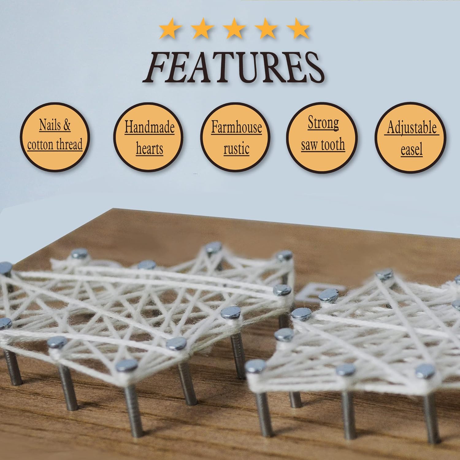 • SOLID WOOD & HAND STRING HEARTS: Use solid wood material, hand made string hearts, special two hearts pure white printing on rustic walnut colored frames