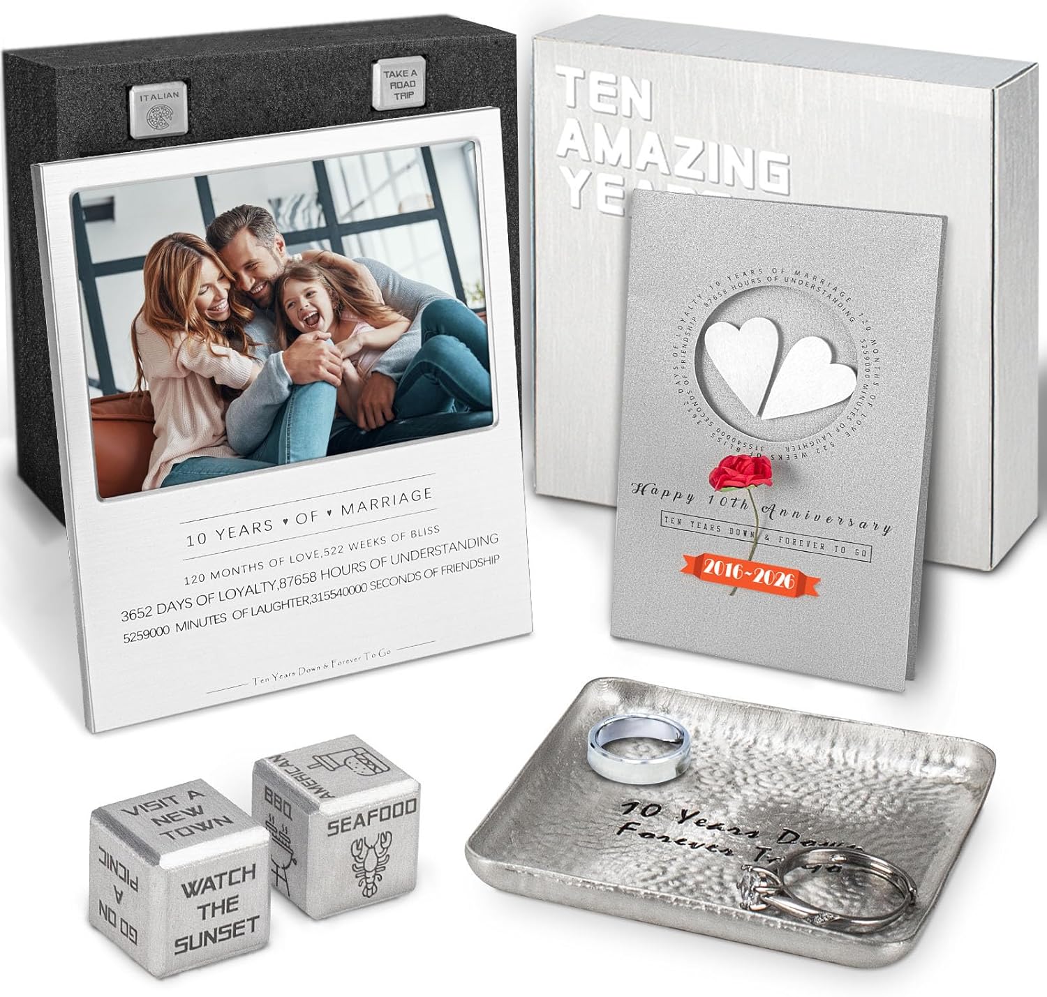 - Thoughtful Selection: Our set includes a tin-made Ring Dish for adaptable bonding, a Photo Frame capturing cherished memories, and a Dice Set for unique adventures,accompanied by an Anniversary Card with aluminum hearts symbolizing enduring love.