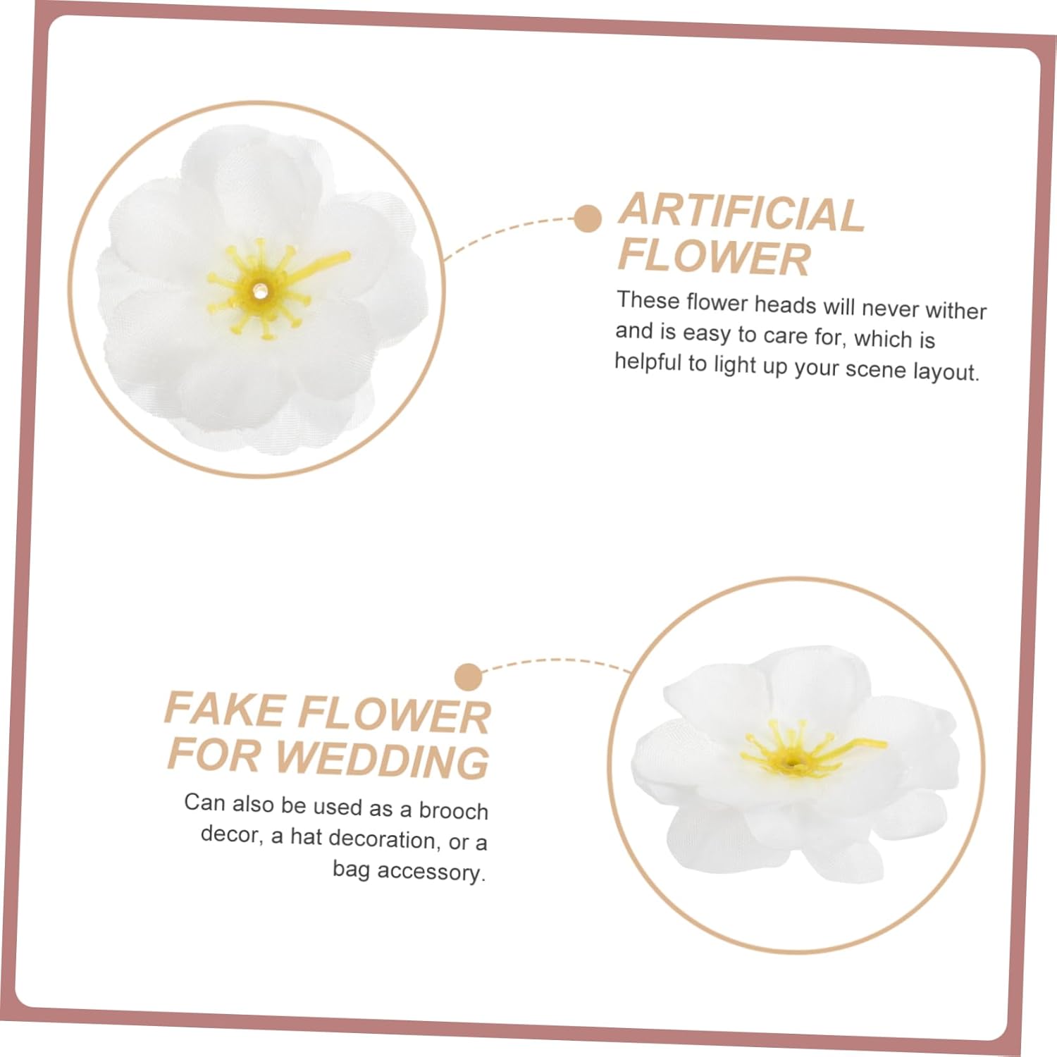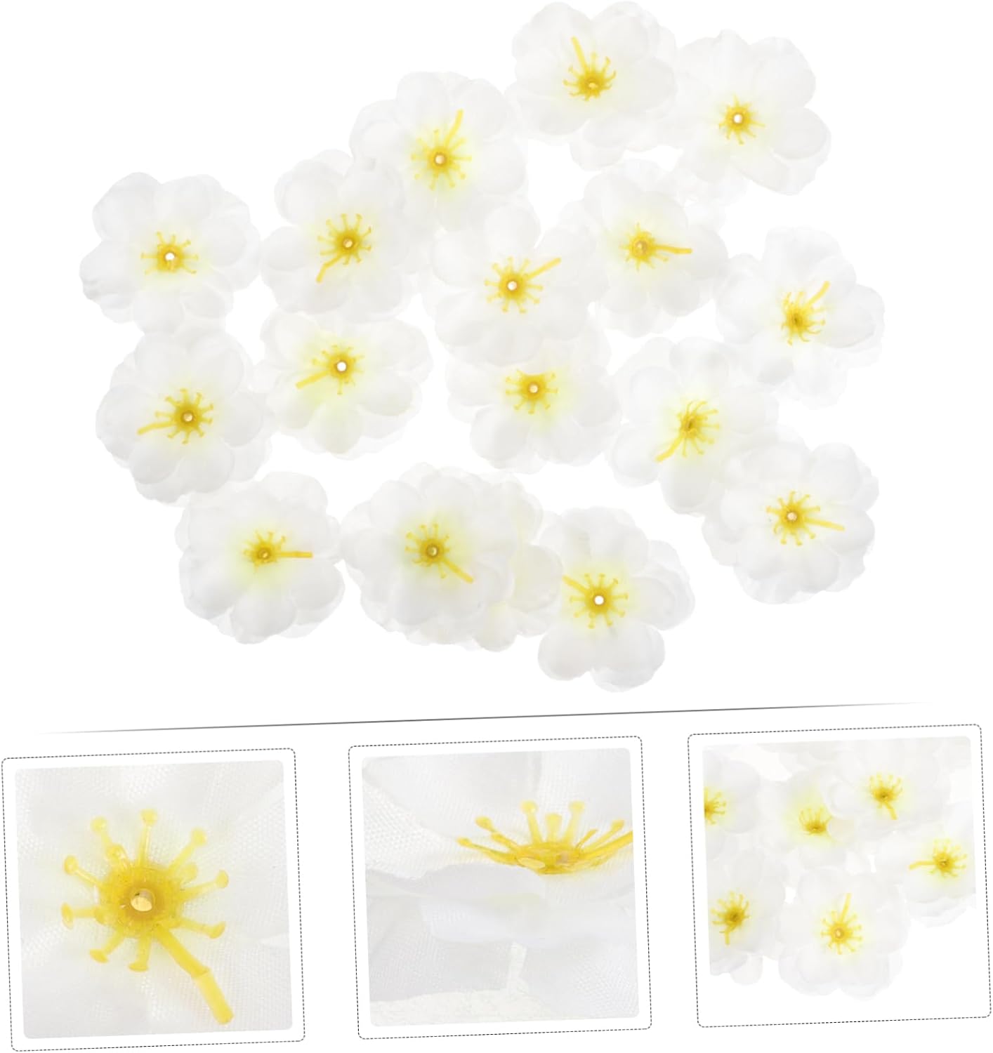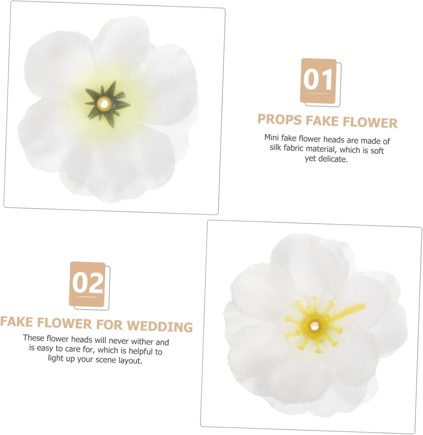 Package Include Fake Flowers Characteristics -Color:White decorative prop -Material:Silk fabric DIY flower material – Multiple combinations: these false flowers can match different colors to create unique looks fake flowers heads. -Size:4.50X4.50X0.10cm/1.77X1.77X0.04in flowers heads for crafts – Suitable for various occasions: Weddings, parties, prom, or everyday wear. Widely used flower heads. – Mini fake flower heads are made of silk fabric material, which is soft yet delicate flower heads decoration. – These flower heads will never wither and is easy to care for, which is helpful to light up your scene layout flower decor. – Can also be used as a brooch decor, a hat decoration, or a bag accessory DIY lifelike flower heads.Goods Descriptionsilk flower heads for crafts It will light up your scene layout and leave you unforgettable memory.lifelike flower heads Are you looking for false flowers ornament which is suitable for wedding decoration? This artificial flowers ornament with vivid details is made of silk fabric material for and use
