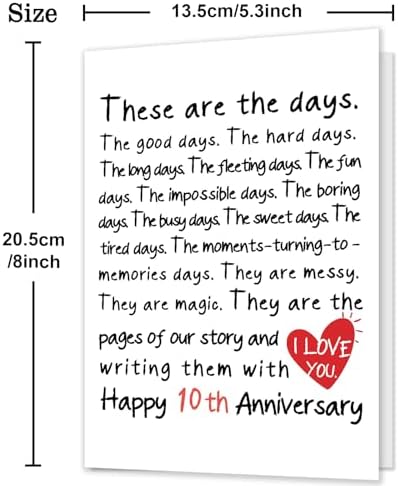• 10 Year Anniversary Gifts for Him: Includes one anniversary card and one envelope. Card size is 5.3 inches wide and 8 inches long.