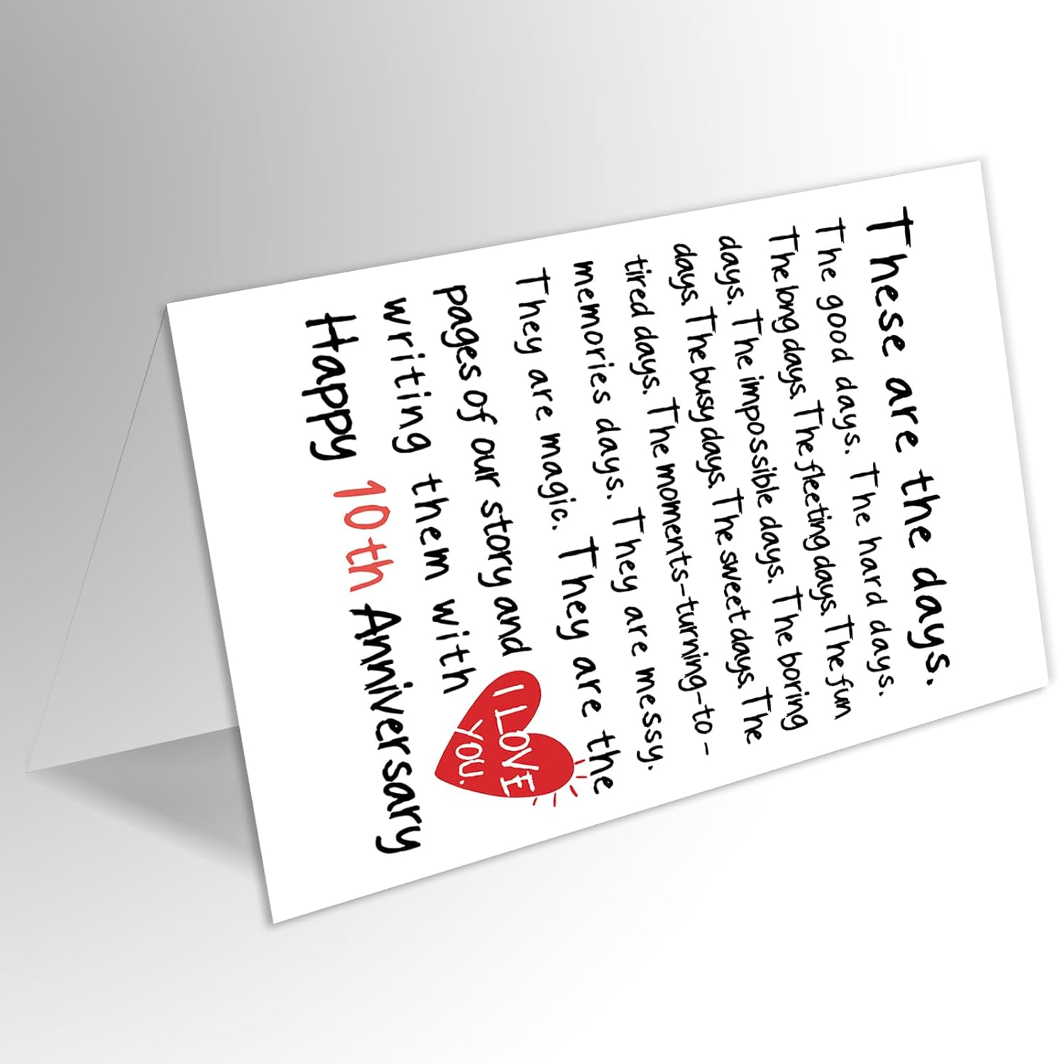 • This 10th anniversary card is crafted with heartfelt emotion at its core — using simple words and gentle warmth to capture the real, shining moments of love. It celebrates life, not just love. It embraces imperfection and treasures every piece of the everyday — the laughter, the weary days, the quiet moments, and the warmth of being together. These are what make love truly beautiful.
