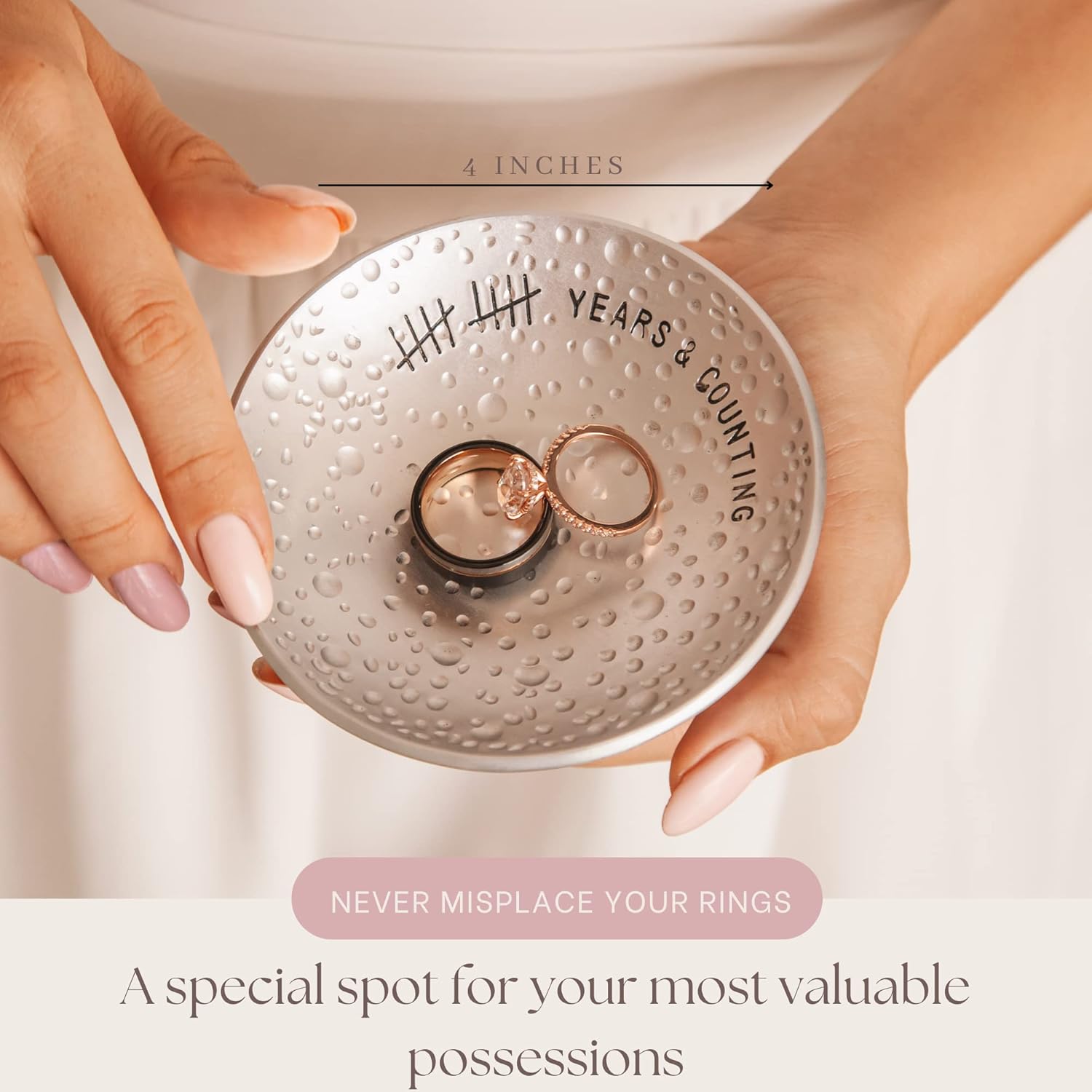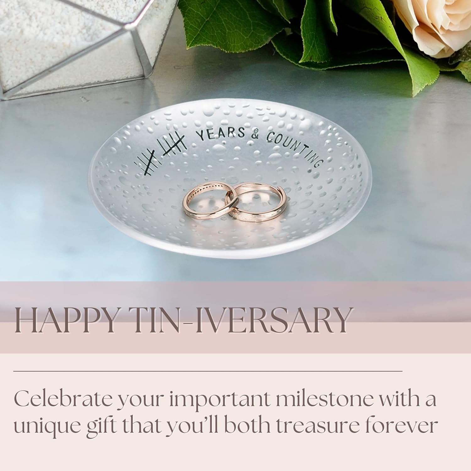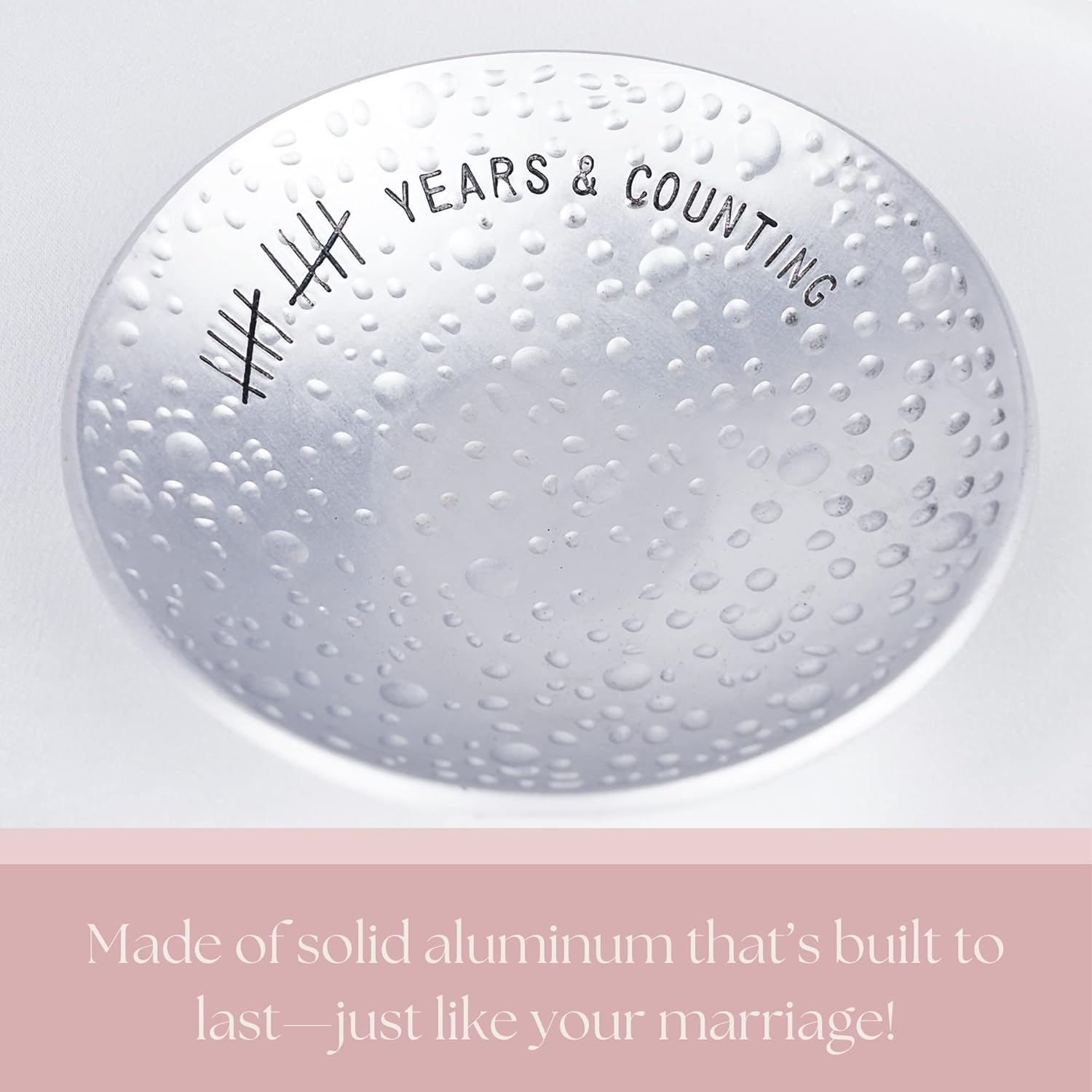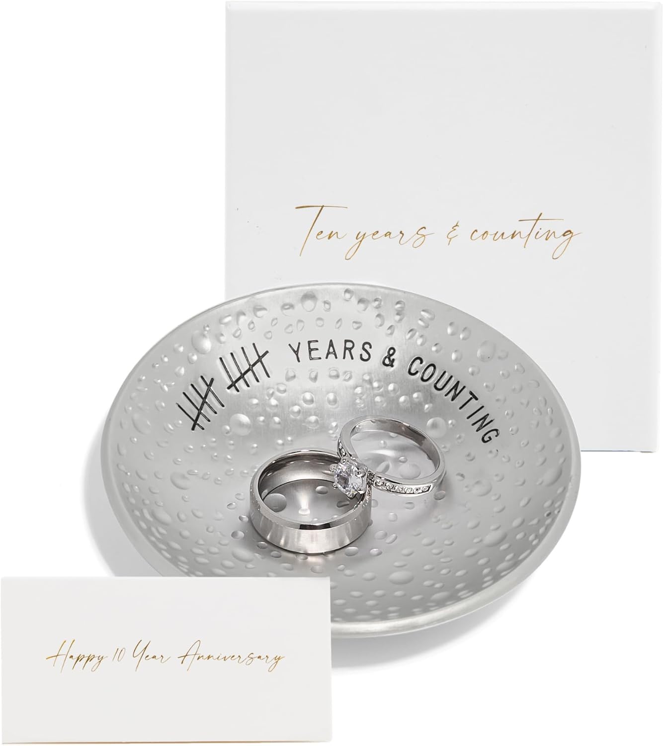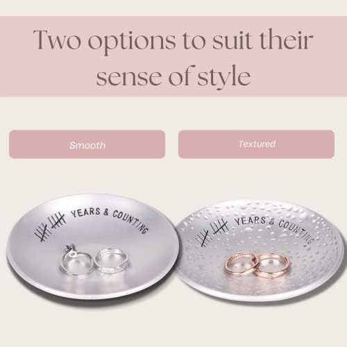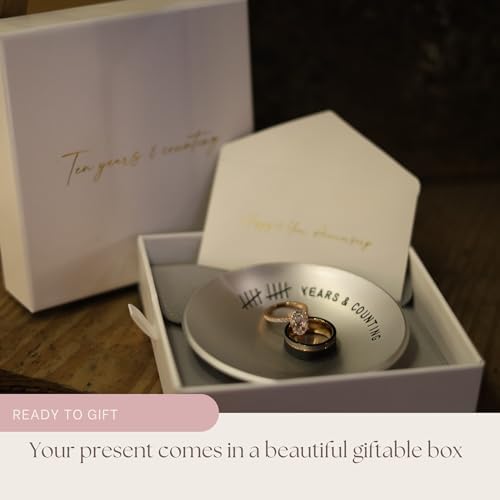 - 10 Years & Counting – A decade of love and commitment is a milestone worth celebrating! Celebrate your tin anniversary with an engraved, aluminum jewelry dish that will last as long as your marriage.