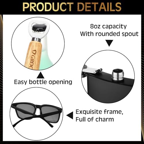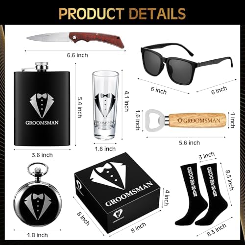 - Groomsmen Gift Set: the groomsmen proposal gift set contains most things you need to thank your groomsmen and make them feel special, with 1 pieces of each item, including 8 oz flasks, shot glasses, beer bottle openers, sunglasses, raffia, envelope, greeting card, tuxedo pocket watch, folding knife, toiletry bag, gift boxes, gift bag, and socks, this groomsmen gift set is a complete and thoughtful gift
