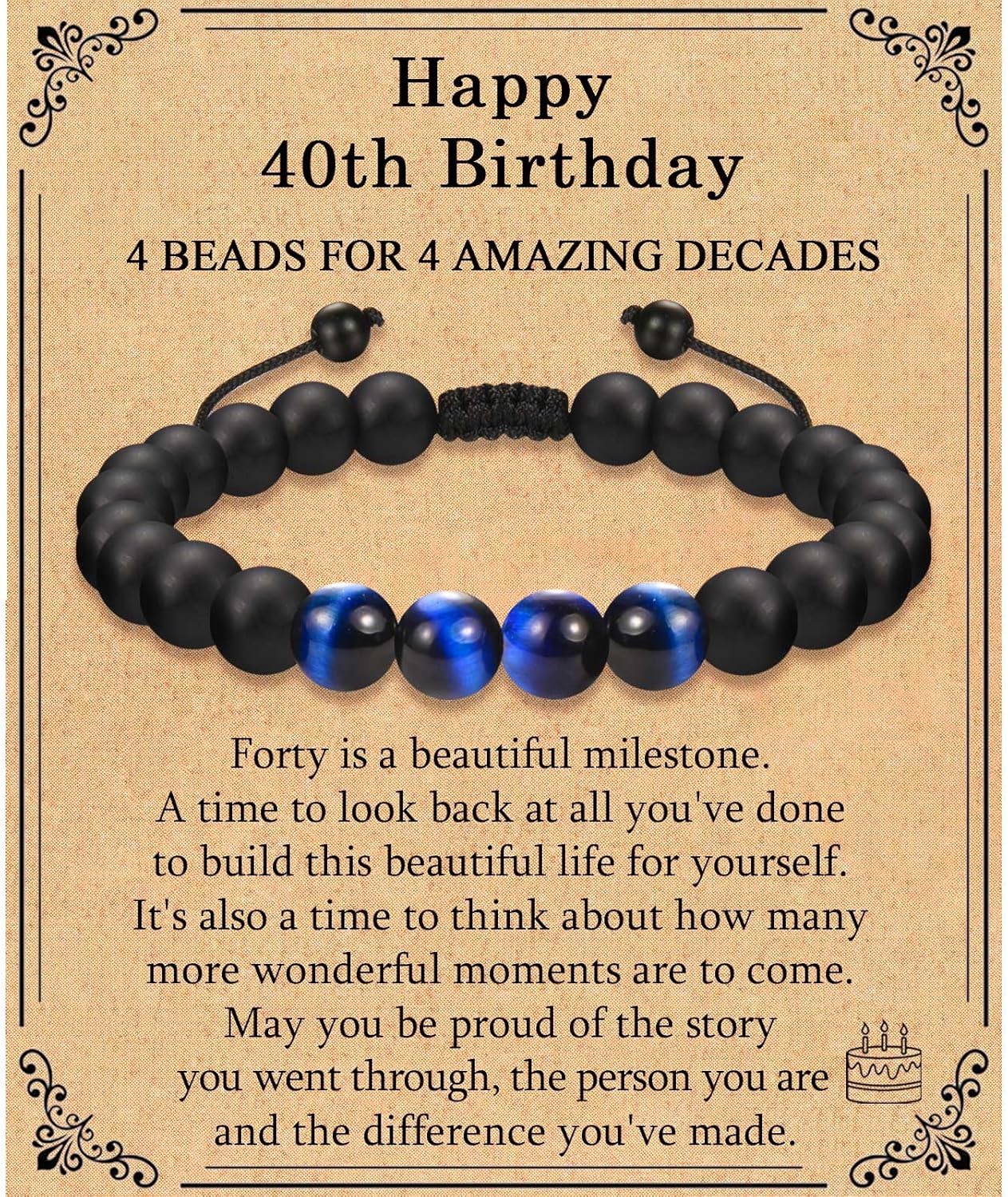 - 40th Birthday Gifts for Men: Special design: 4 blue agate beads to symble an unbelievable 40 years. Send 40 year old birthday gifts for men to remember this sweet day on his 40th birthday. He must be happy to get this meaningful birthday gift from you