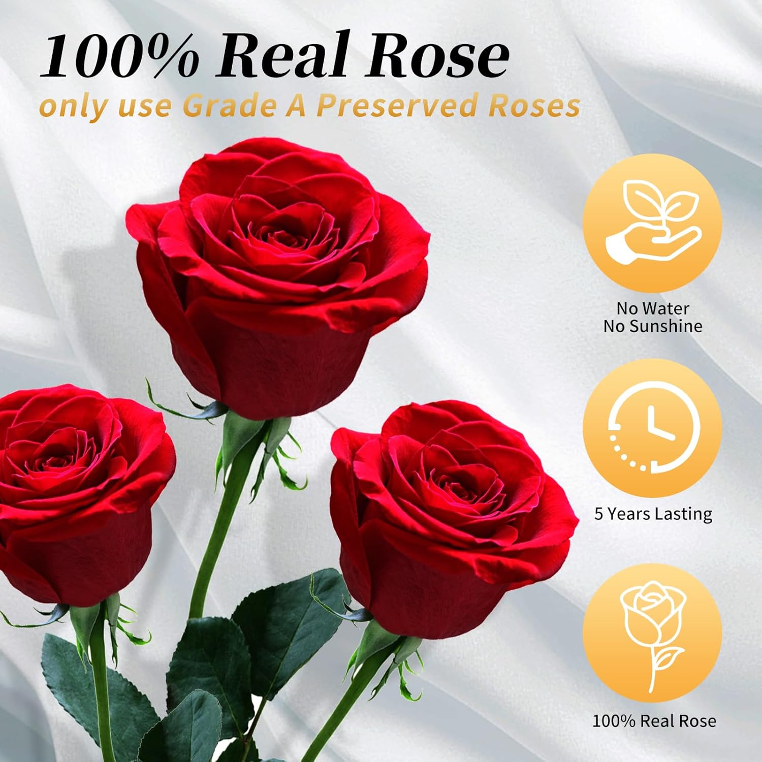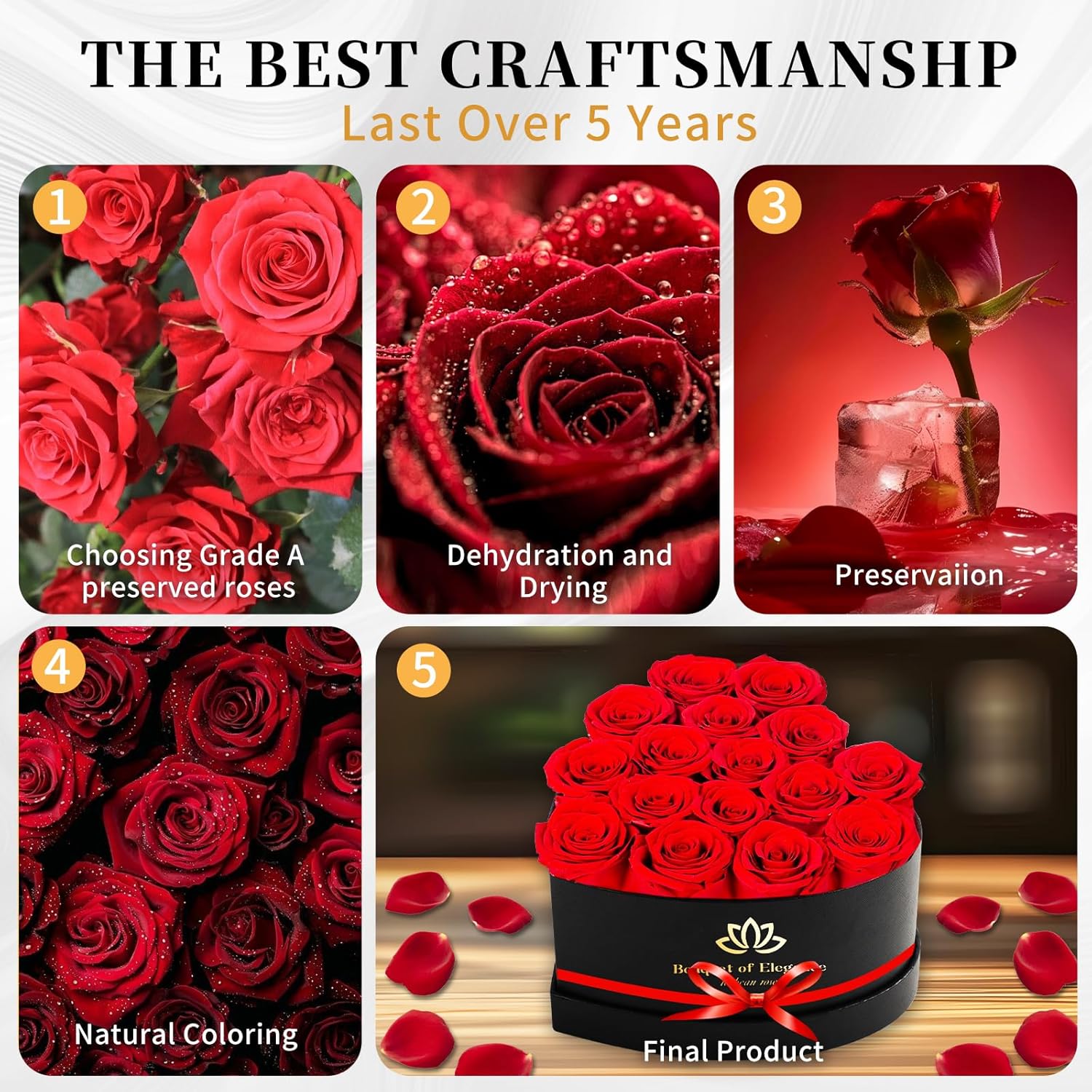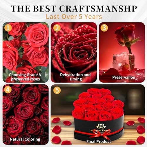 - 𝐅𝐨𝐫𝐞𝐯𝐞𝐫 𝐅𝐫𝐞𝐬𝐡 𝐅𝐥𝐨𝐰𝐞𝐫𝐬: 100% Real Roses.These roses professional dehydration through complex process, and their qualities have been preserved to last Over 𝟓 𝐲𝐞𝐚𝐫𝐬, with no maintenance or watering required.