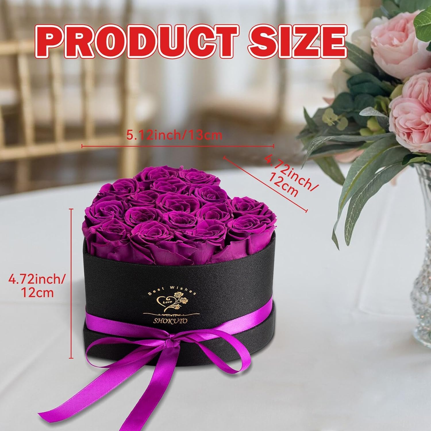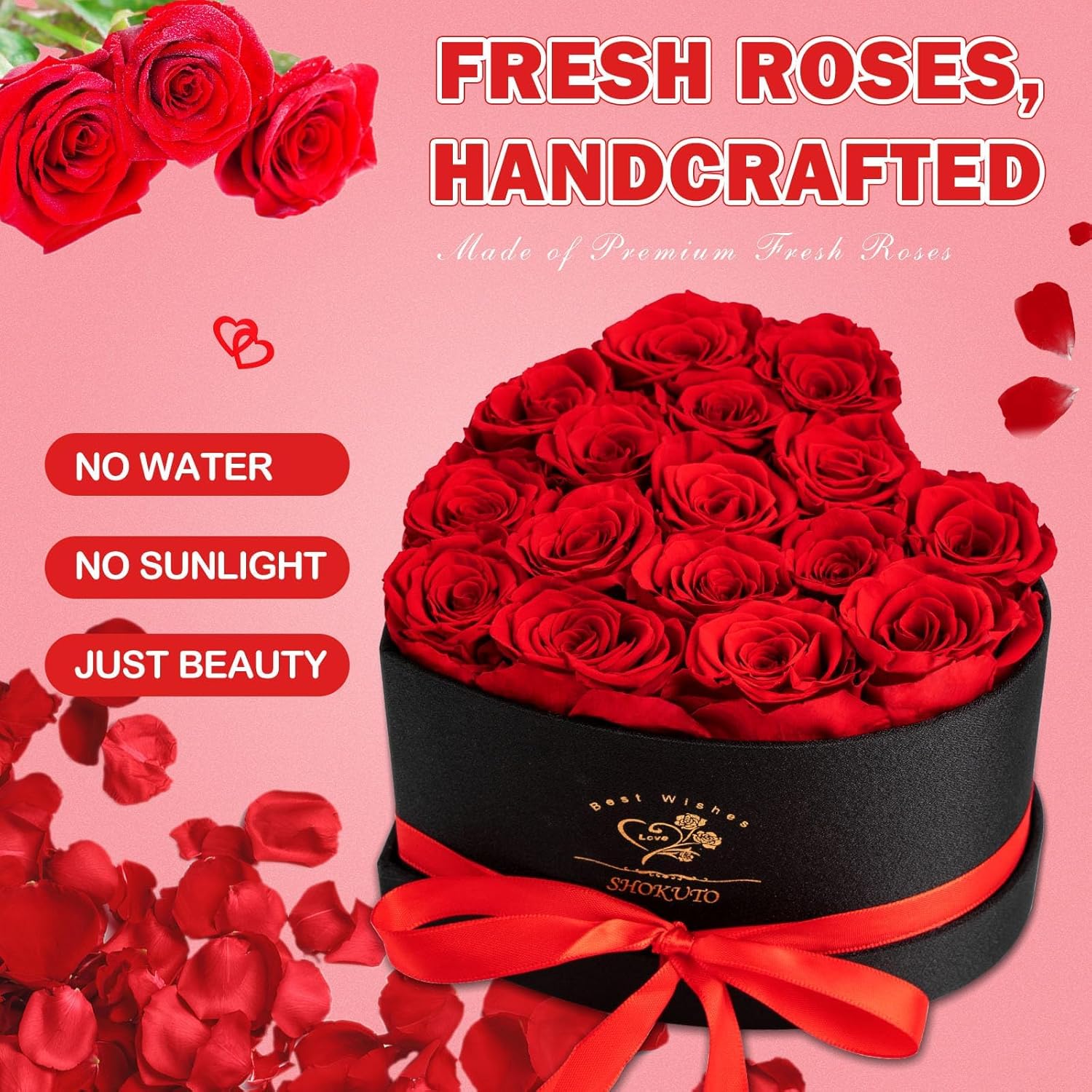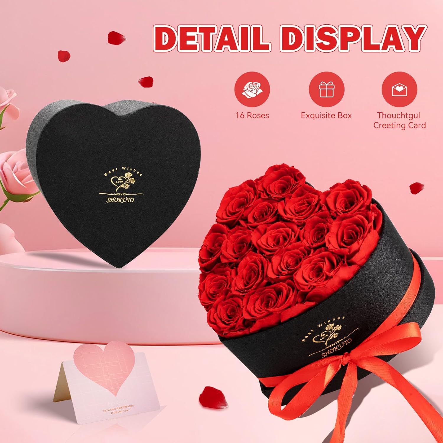 • Immortal Love in Heart-Shaped Rose Box:Express your everlasting love with our SHOKUTO 16 Forever Roses in a Heart-Shaped Gift Box. This exquisite box measuring 7.9” x 7.9” x 5”, contains 16 beautifully preserved roses, each 4-5cm in size. Unlike typical artificial flowers, our high-quality preserved flowers bouquet capture the natural beauty and enduring joy of fresh blooms. Perfectly arranged in a heart-shaped design, this gift ensures your gesture stands out in both appearance and emotional impact.