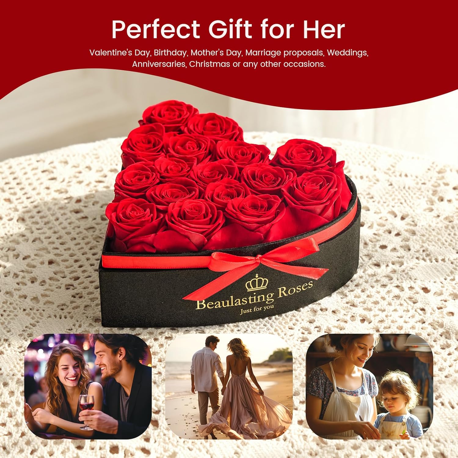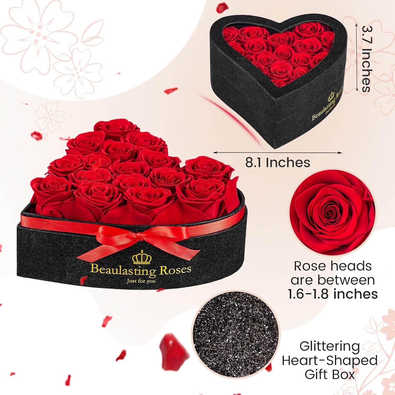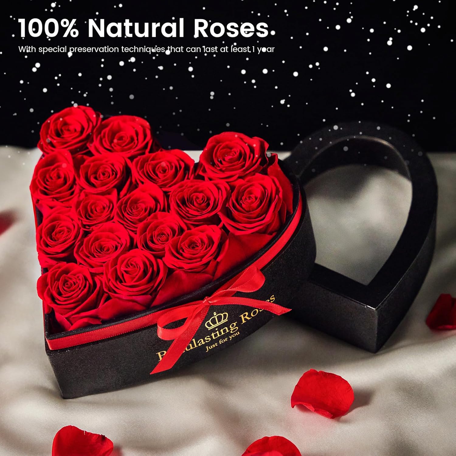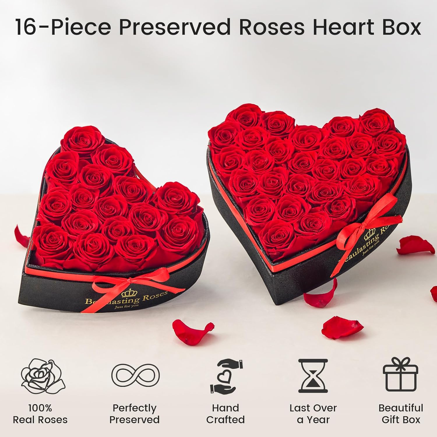 - 16 Piece Eternal Roses Collection: This heart-shaped box is filled with 27 meticulously preserved roses, each one carefully crafted to maintain its natural beauty and vibrant color for years to come. Unlike fresh flowers, these preserved roses require no maintenance and will never wilt or fade.