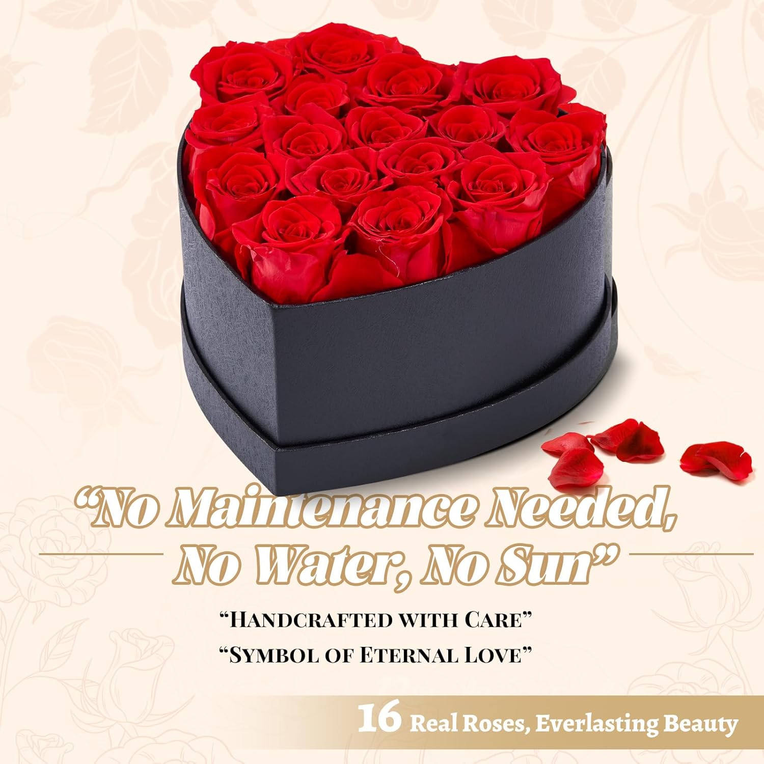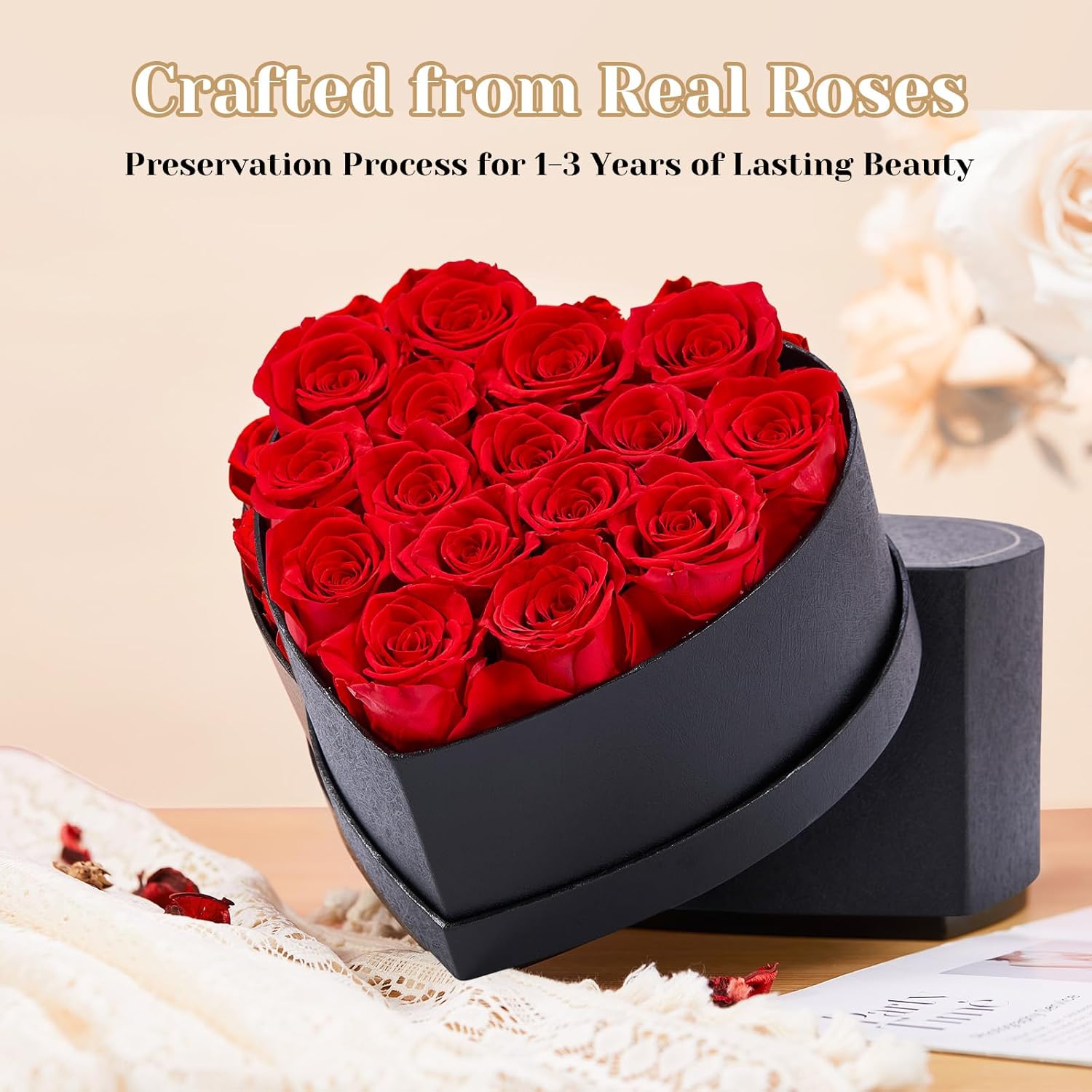 - 🎁 [Elegant Heart-Shaped Display Box] – Housed in a sophisticated black heart-shaped box, our forever flower bouquet makes an elegant statement piece or décor for any setting. Just keep it away from water and direct sunlight for lasting beauty.