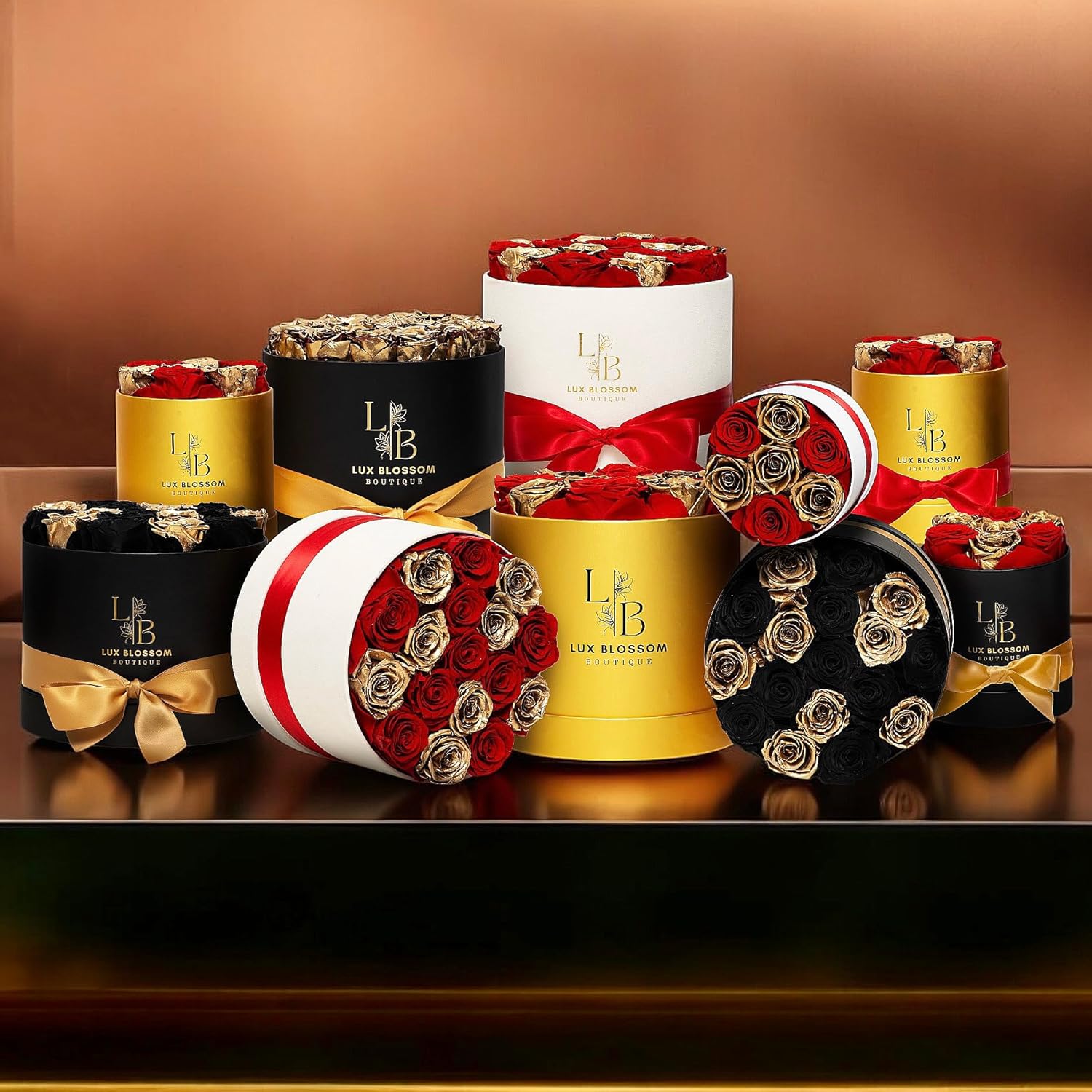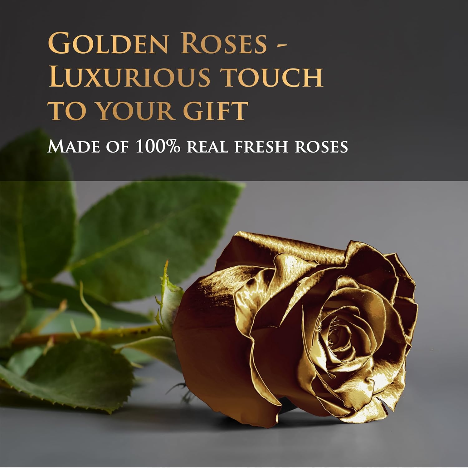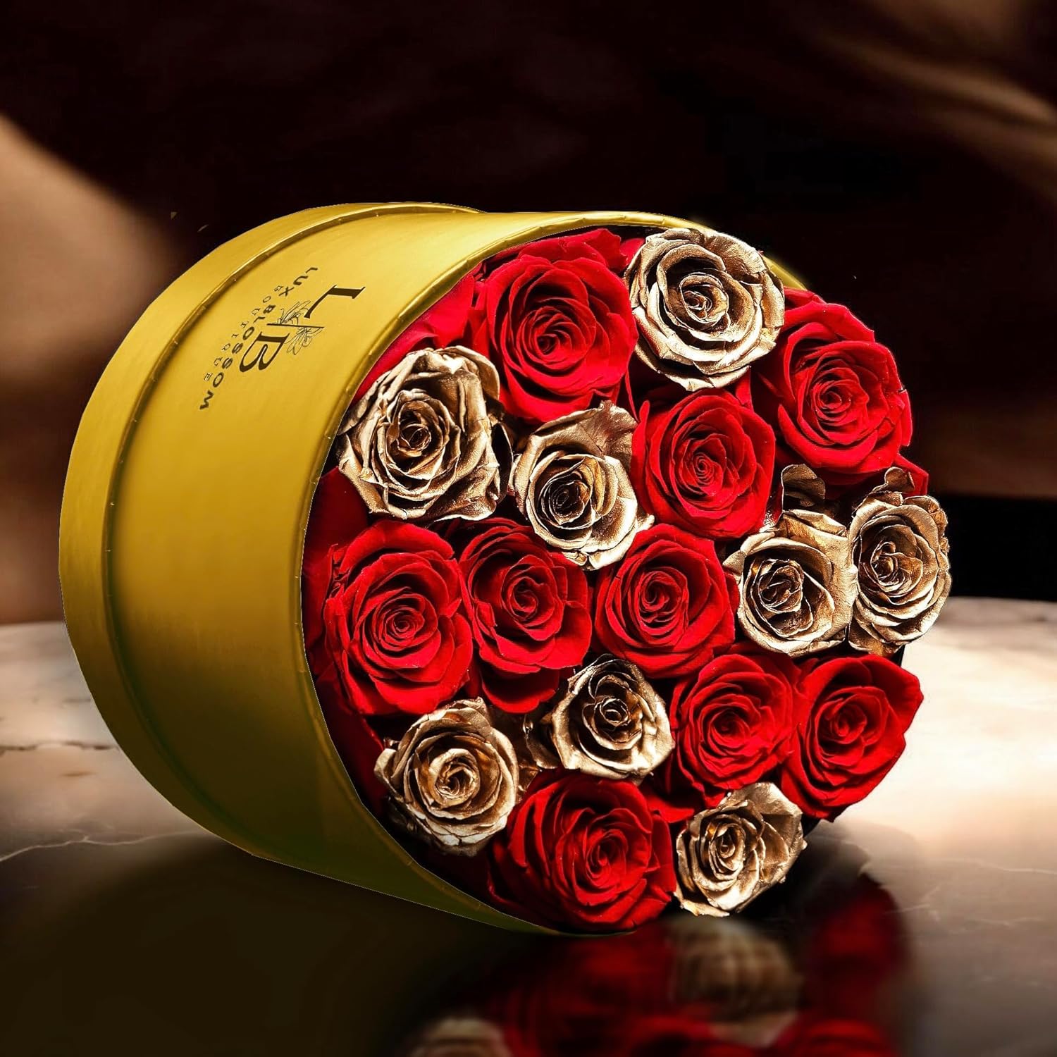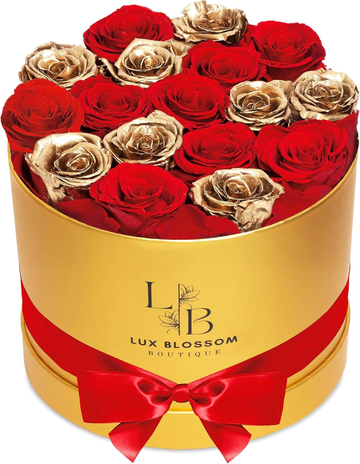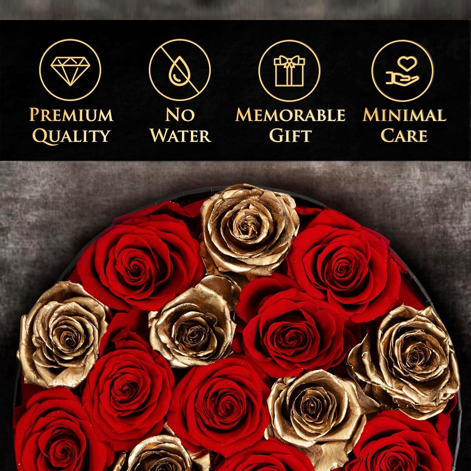 - Classy Golden Roses: Featured in every box, they add a luxurious and glamorous feel to the flower arrangement; paired with deep red roses, these gold flowers create a beautiful and sophisticated look that makes them a better alternative to glitter flowers, fake, or fresh roses