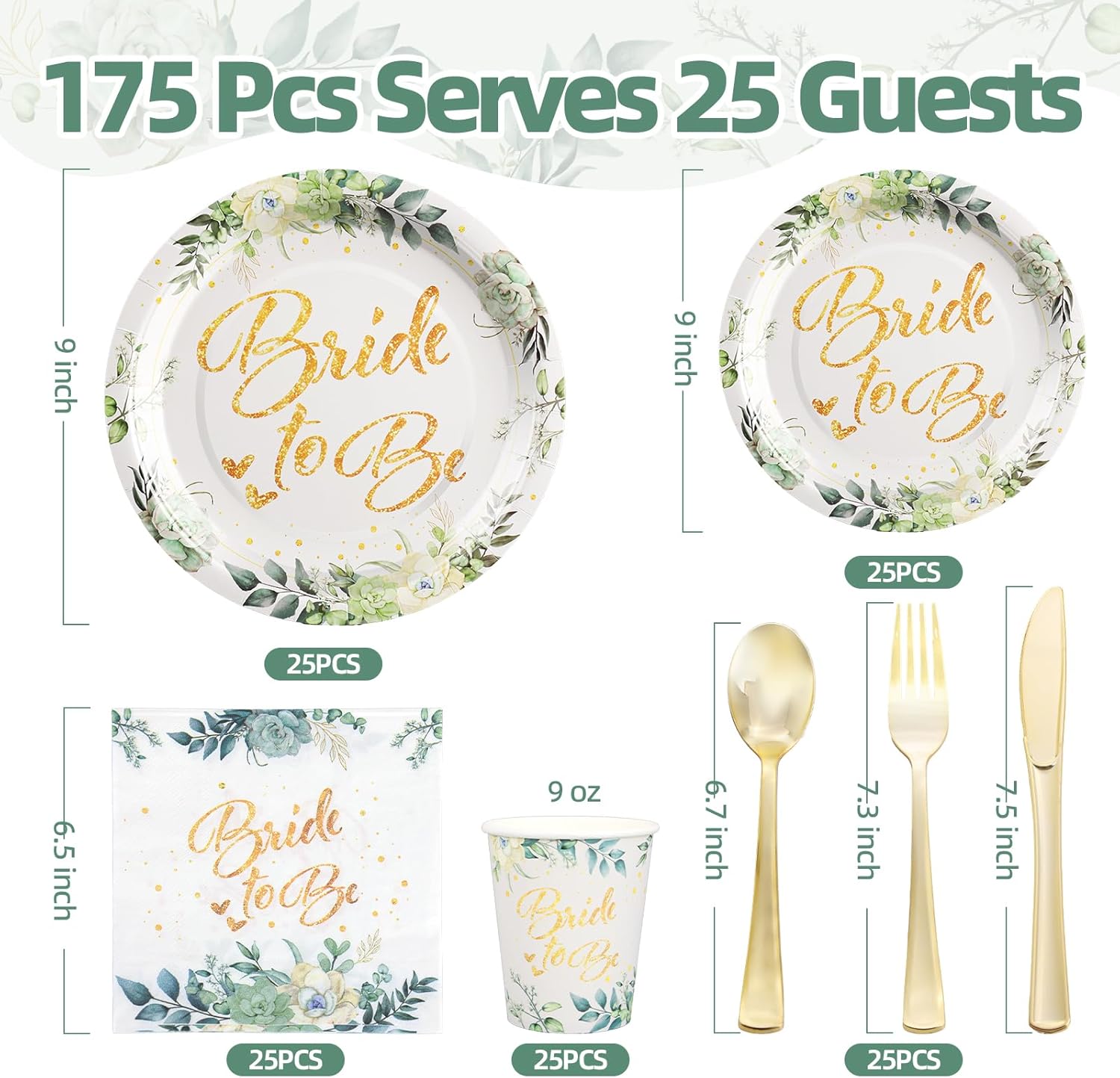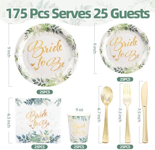 - 【Bridal Shower Tableware Set】Bridal shower plates and napkin sets can serve 25 guests at the same time. The set includes: 25 9-inch bridal shower dinner plates, 25 7-inch bridal shower dessert plates, 25 9oz paper cups, 25 6.5-inch napkins, and 25 sets of knife, fork and spoon sets, a total of 175 pieces. These bridal tableware sets will make your party more interesting and attractive