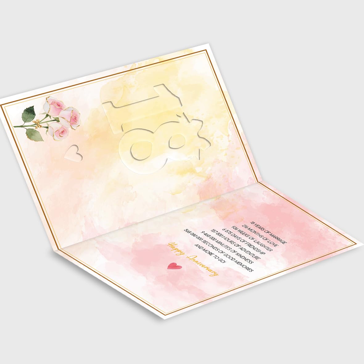 • The number “18” on the cover features a debossed effect. Inside reads: “18 years of marriage, 216 months of love, 936 weeks of laughter, 6,575 days of friendship, 157,800 hours of adventure, 9,468,000 minutes of kindness, 568,080,000 seconds of good memories… and more to go! Happy 18th Anniversary!”