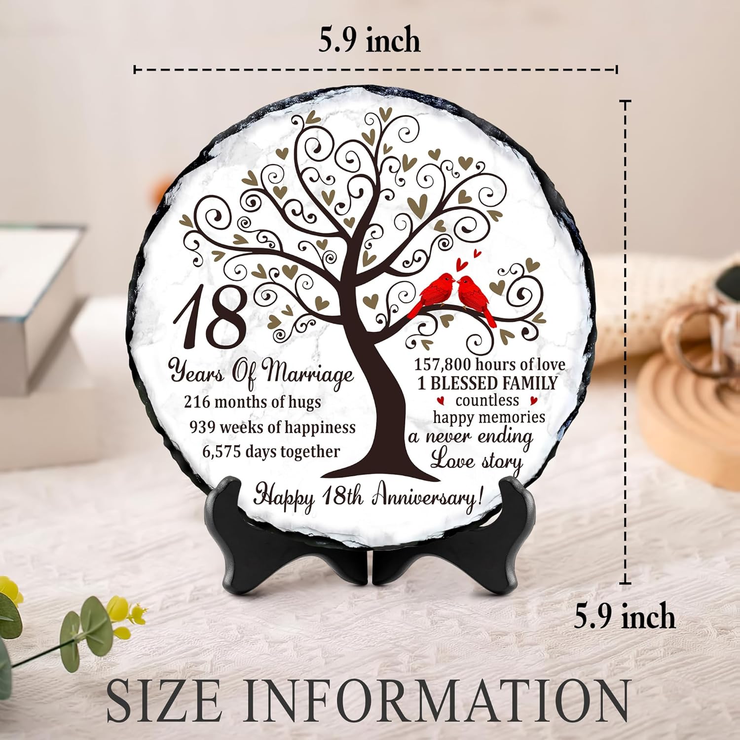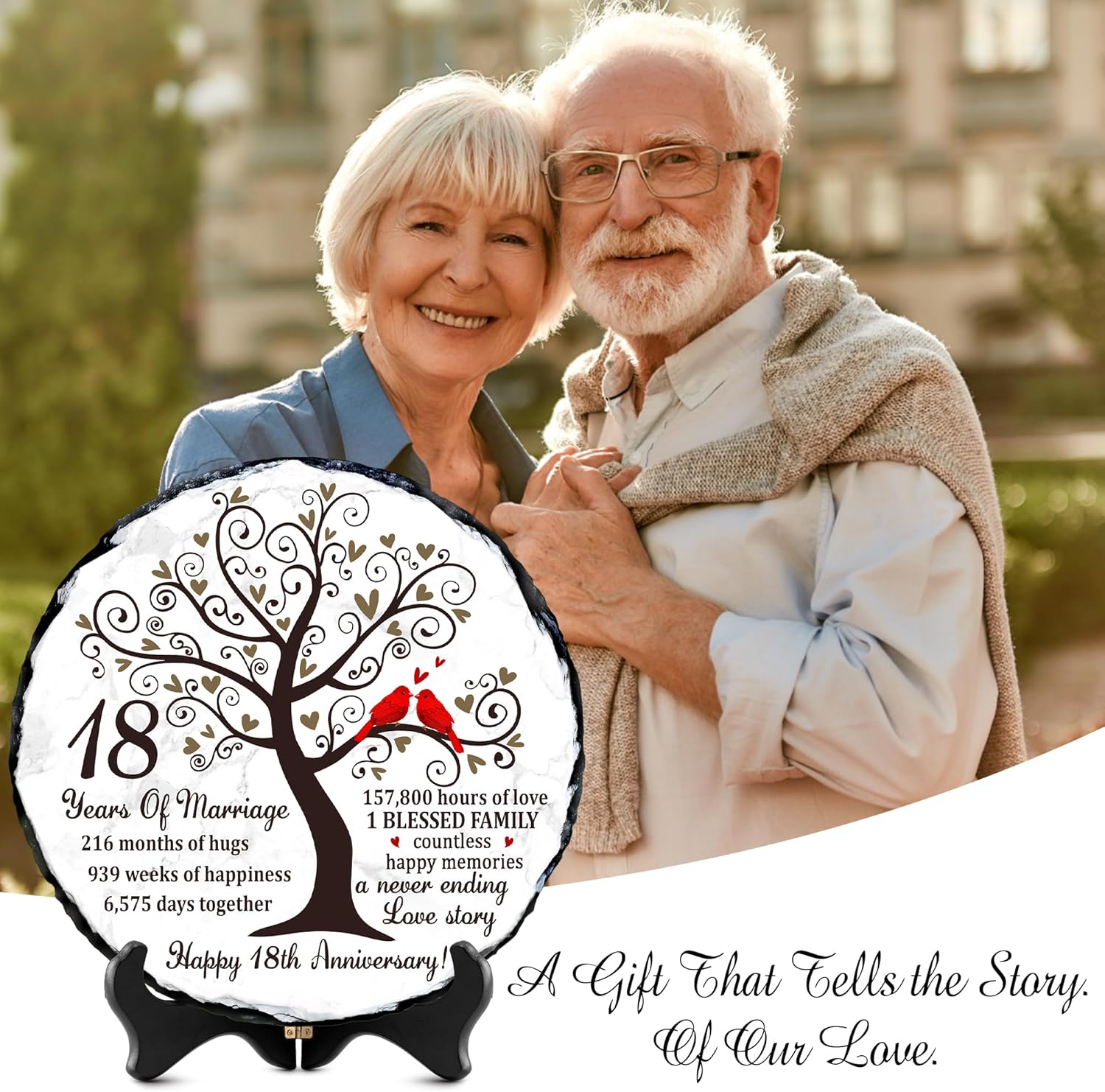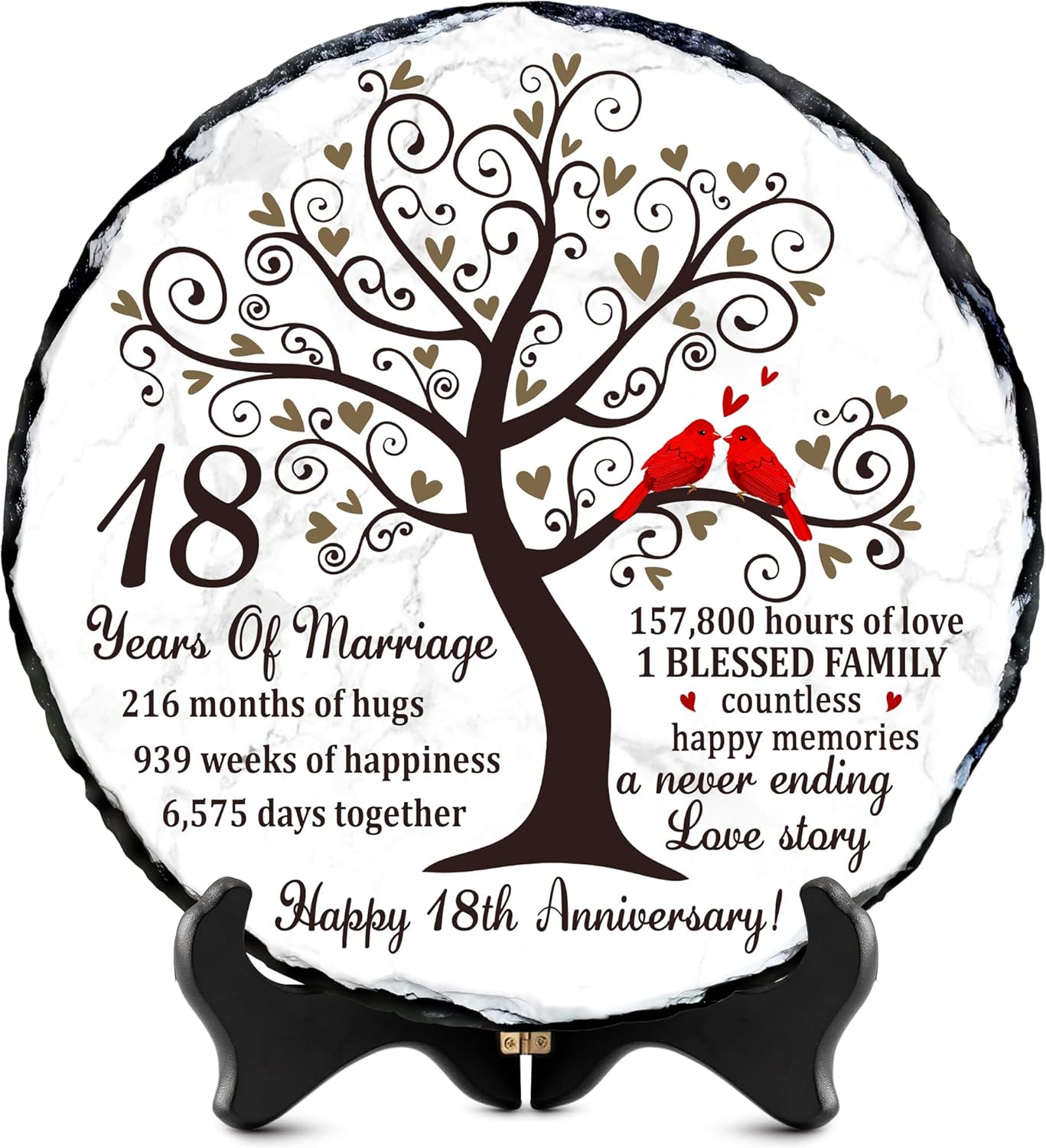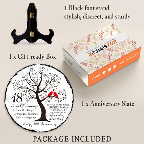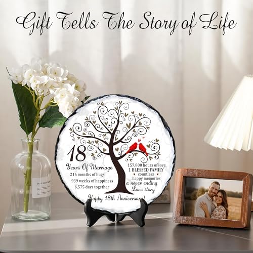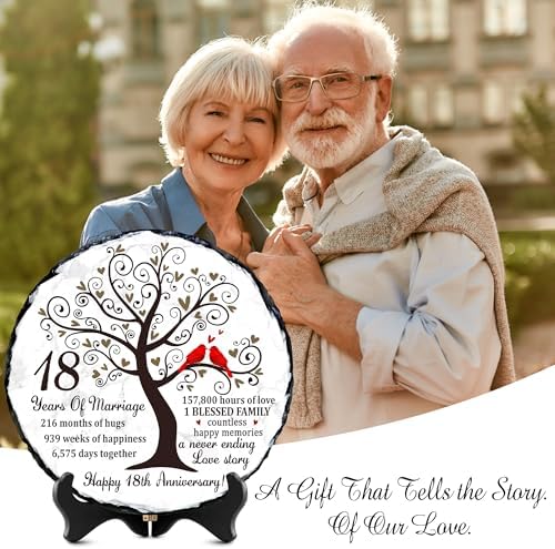 Eighteen years of marriage is a remarkable milestonefilled with unforgettable memories, shared challenges, and continuous growth as a couple. Our Natural Slate Stone 18th Anniversary Plaque is created to honor that journey with emotional depth and timeless beauty. Featuring symbolic artwork of a flourishing tree and a pair of red cardinals, it beautifully represents loyalty, unity, and enduring love. Crafted from premium natural slate, each plaque displays unique stone patterns and handcrafted edges, making it a meaningful option for 18th anniversary gift for husband, 18 year anniversary gifts for her, or anyone following the 18 year anniversary gift tradition. Its weight and texture give it a luxurious presence not found in ordinary printed gifts. The heartfelt wordinghighlighting the years, months, weeks, and hours sharedadds a deeply personal touch, turning it into one of the most sentimental 18 year anniversary gifts for him or her. With the included display stand, it easily enhances home dcor, office spaces, family shelves, or anniversary celebration tables. Whether you’re looking for 18th wedding anniversary gifts, a romantic keepsake, or a meaningful dcor piece that celebrates nearly two decades of love, this natural slate plaque is a touching and lasting choice. It serves as a constant reminder of the beautiful life built together and the countless memories still ahead.