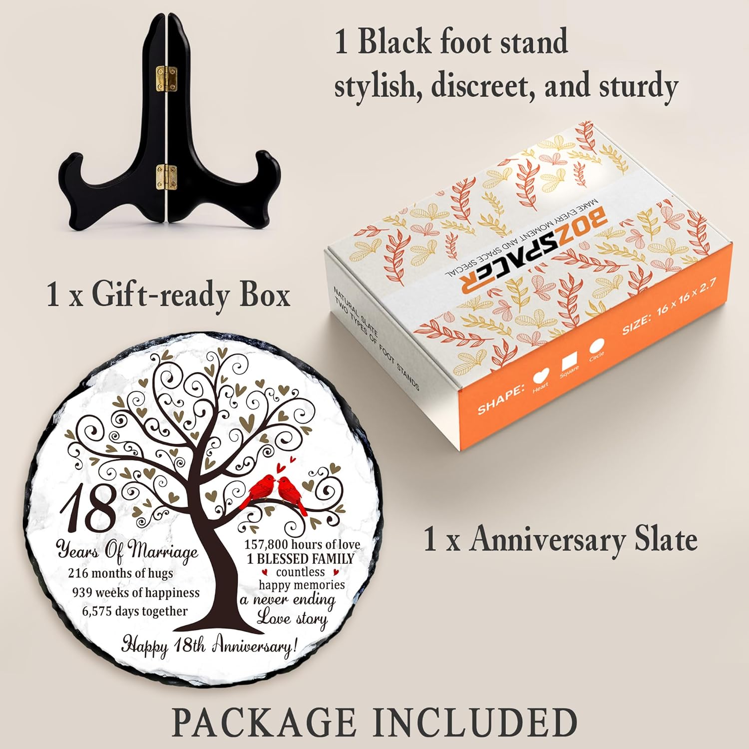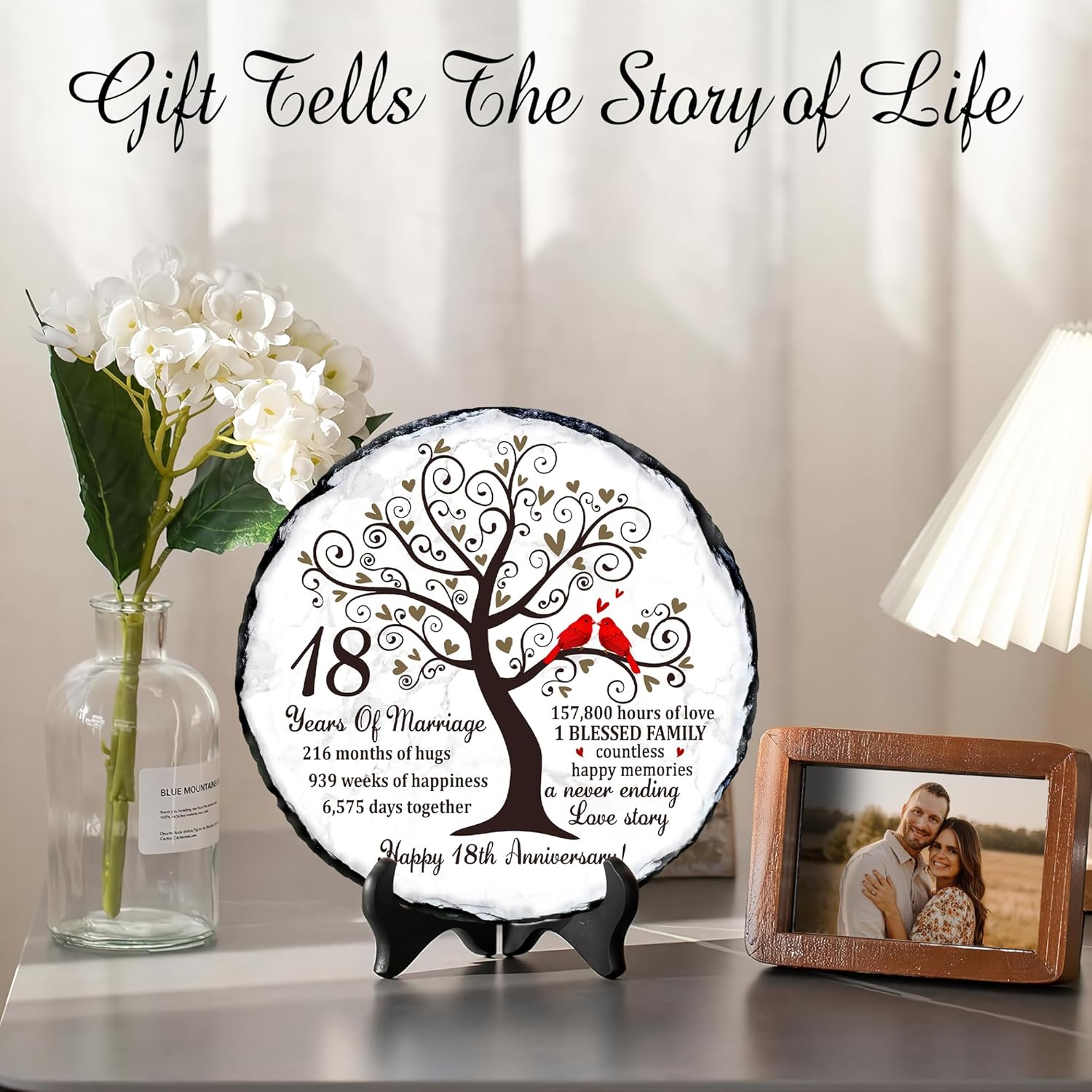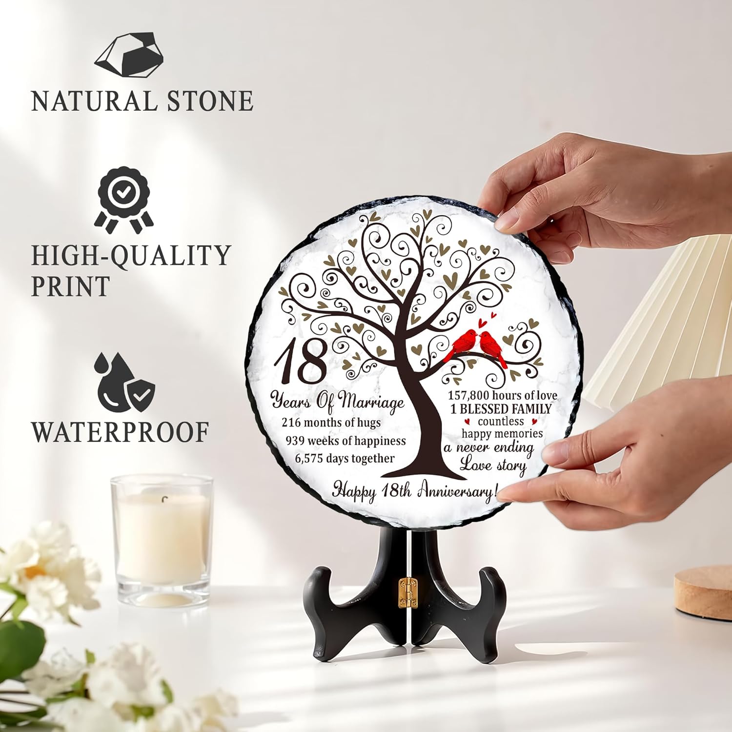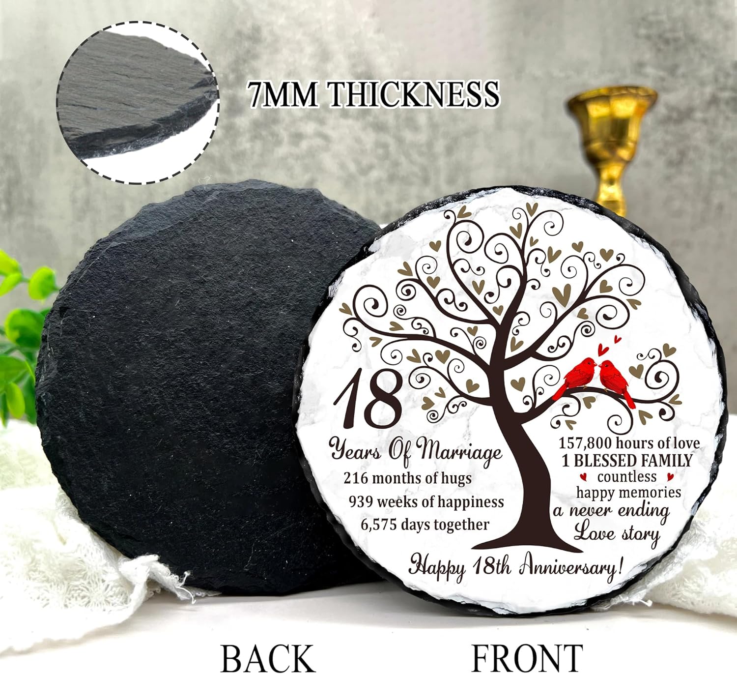 Eighteen years of marriage is a remarkable milestonefilled with unforgettable memories, shared challenges, and continuous growth as a couple. Our Natural Slate Stone 18th Anniversary Plaque is created to honor that journey with emotional depth and timeless beauty. Featuring symbolic artwork of a flourishing tree and a pair of red cardinals, it beautifully represents loyalty, unity, and enduring love. Crafted from premium natural slate, each plaque displays unique stone patterns and handcrafted edges, making it a meaningful option for 18th anniversary gift for husband, 18 year anniversary gifts for her, or anyone following the 18 year anniversary gift tradition. Its weight and texture give it a luxurious presence not found in ordinary printed gifts. The heartfelt wordinghighlighting the years, months, weeks, and hours sharedadds a deeply personal touch, turning it into one of the most sentimental 18 year anniversary gifts for him or her. With the included display stand, it easily enhances home dcor, office spaces, family shelves, or anniversary celebration tables. Whether you’re looking for 18th wedding anniversary gifts, a romantic keepsake, or a meaningful dcor piece that celebrates nearly two decades of love, this natural slate plaque is a touching and lasting choice. It serves as a constant reminder of the beautiful life built together and the countless memories still ahead.