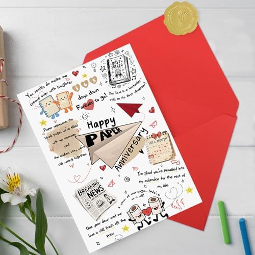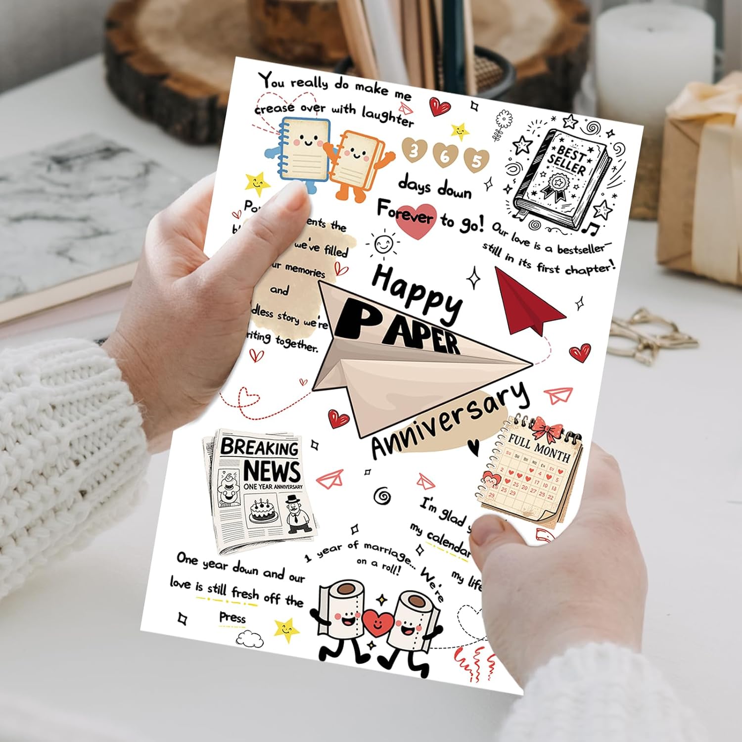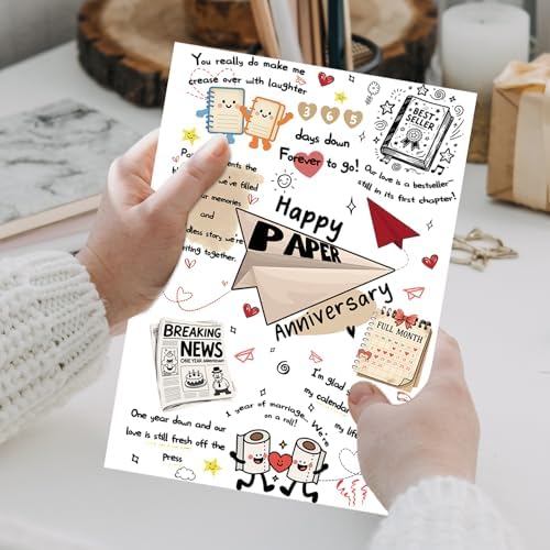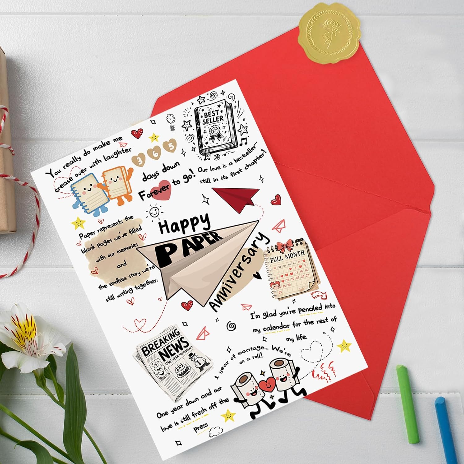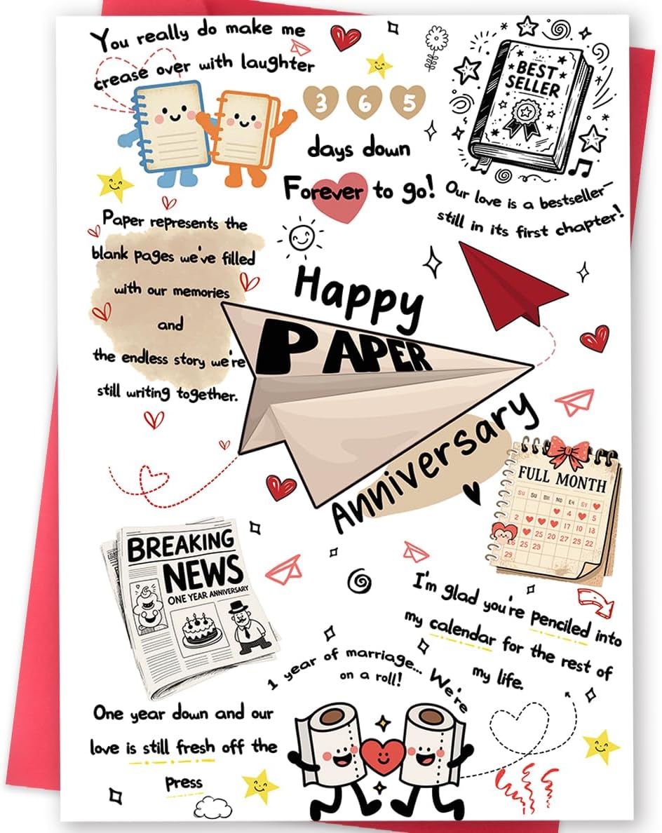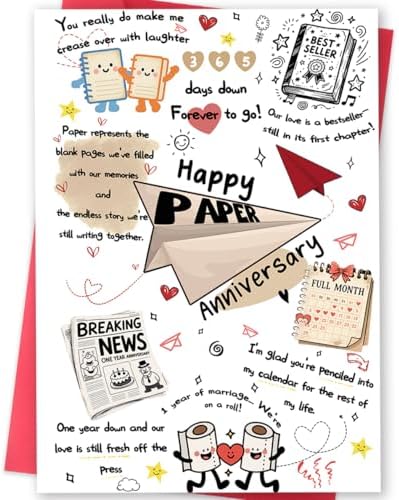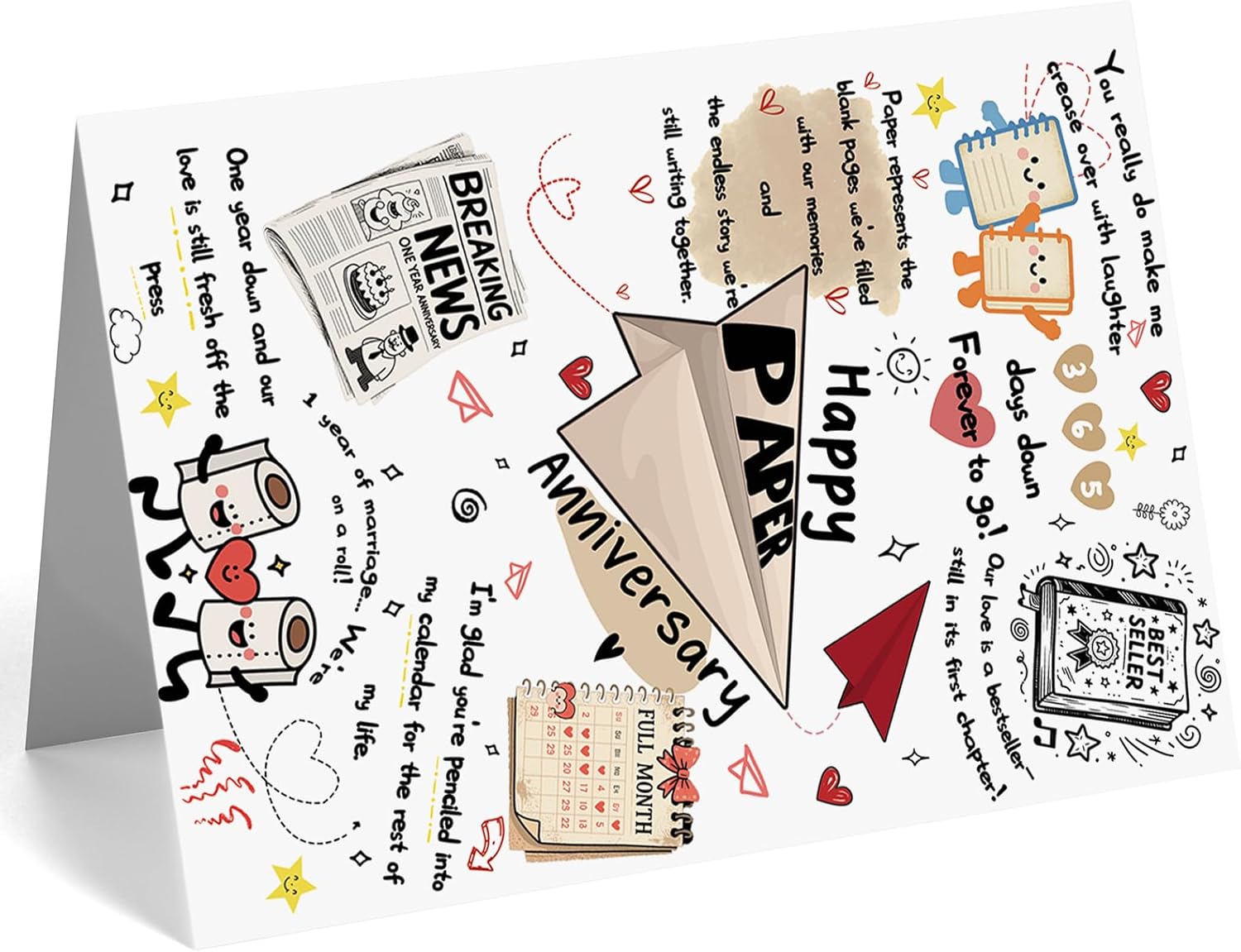• 1 Year Anniversary Gifts: An interesting one-year anniversary greeting card, combining the theme of paper wedding with romantic copy, is the perfect choice for a one-year anniversary gift