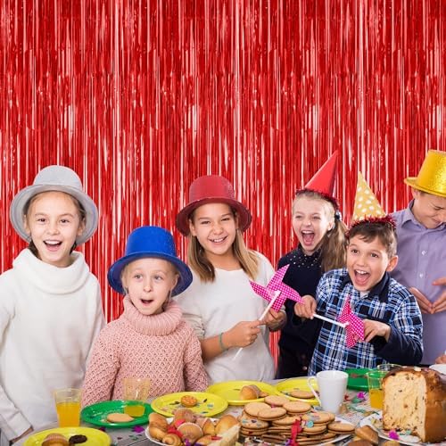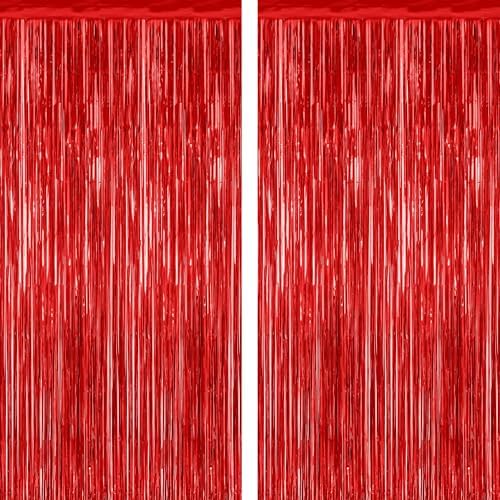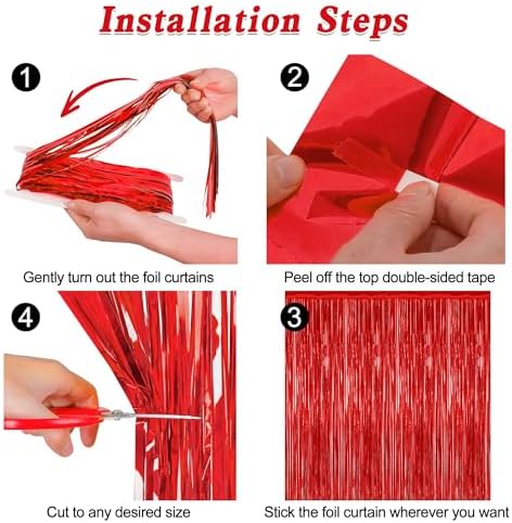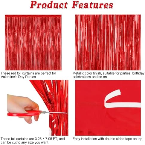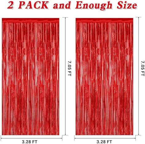 - Package Contents: The package includes 2 pcs red foil curtains, each with dimensions of 3.28 FT x 7.05 FT. These Valentines tinsel curtains can be trimmed to fit any specific area.
