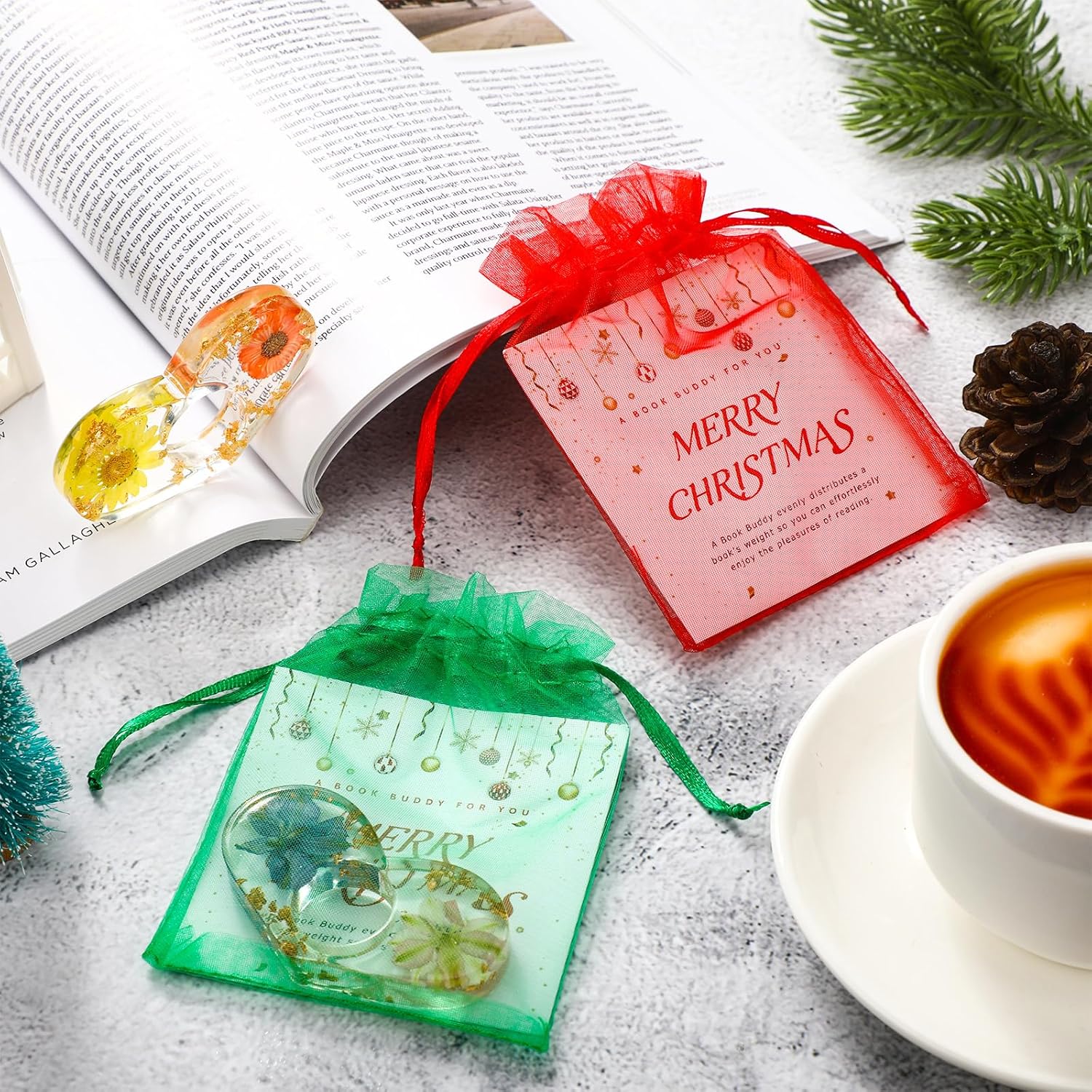 - Christmas Book Buddy: you will get 2 pcs of bookmarks and 2 pcs of cards, which are equally packed in a red organza bag and a green organza bag; Each bag contains 1 pc of bookmark and 1 pc of card; Two sets of small gifts can meet your gift giving needs among book friends during Christmas