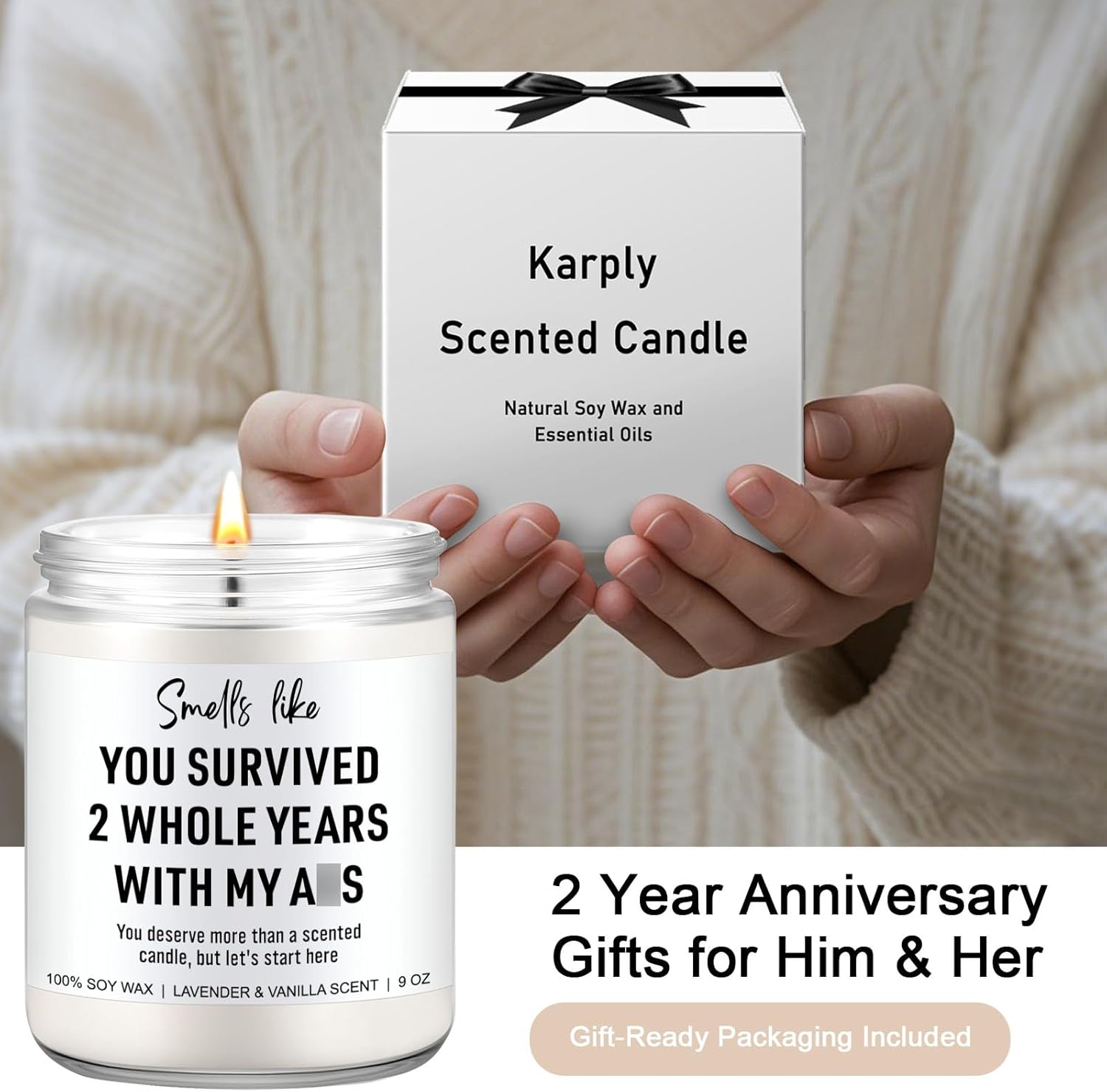 Karply soy candles with lids come in a giftable black box. These aromatherapy candles printed with humorous quotes on the labels are great as cotton 2nd anniversary gift, 2 year anniversary gifts for him, 2 year anniversary gifts for her, 2nd anniversary gifts for him, 2nd anniversary gifts for her, cotton anniversary gifts for him, cotton anniversary gifts for her, two year anniversary gift for him, two year anniversary gift for her, 2 year anniversary gifts for women, 2 year anniversary gifts for men, 2nd anniversary gifts for couple, 2nd anniversary gifts for wife, 2nd anniversary gifts for husband, 2 year dating anniversary gifts, 2 year marriage anniversary gifts, 2nd wedding anniversary gifts, valentines day gifts for her, valentines day gifts for him, romantic gifts for her, romantic gifts for him, I love you gifts for him, I love you gifts for her, and more.