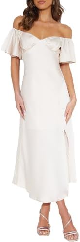 - Material: Women satin off shoulder midi dress. Made of smooth satin with a soft touch and breathability, it is light and romantic with a flowing and elegant feel suitable for all summer and looks stunning in the sun.