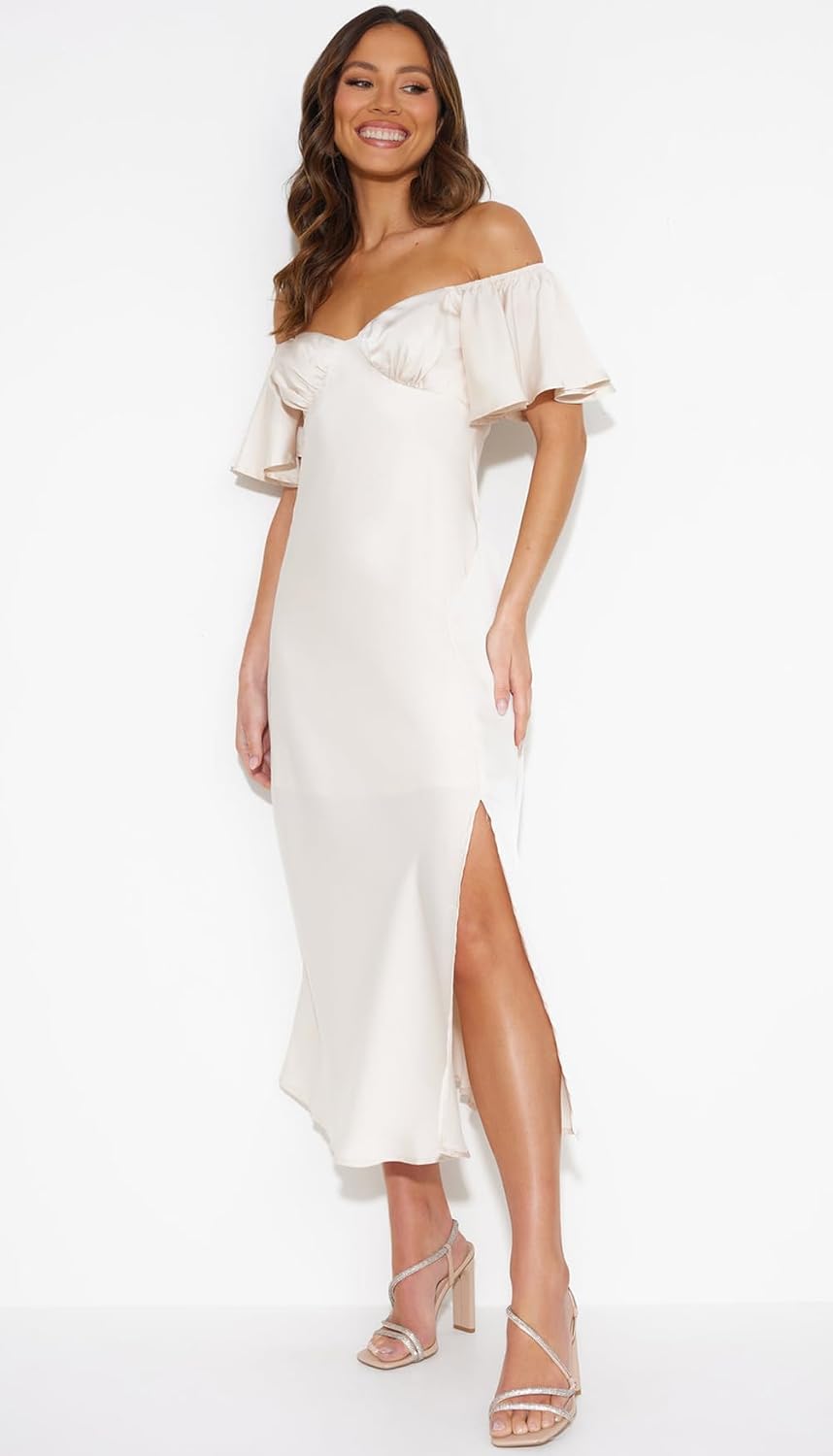 - Design: Summer midi dress for women, wedding guest dresses for women, dresses for women 2025 elegant, bridesmaid dresses for women. Off shoulder, short ruffle sleeves, gathered cup detailing on bust, button in back, side slit, zipper in side, elasticated neckline and shoulders. The floating design is impressive.