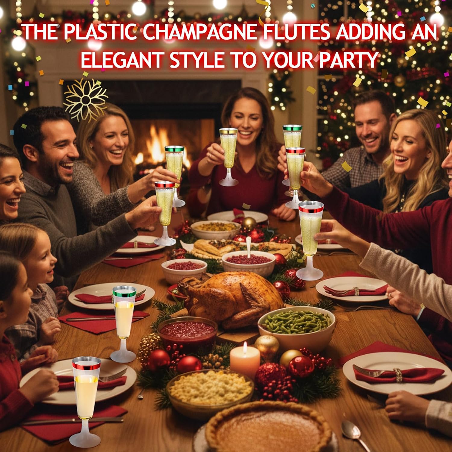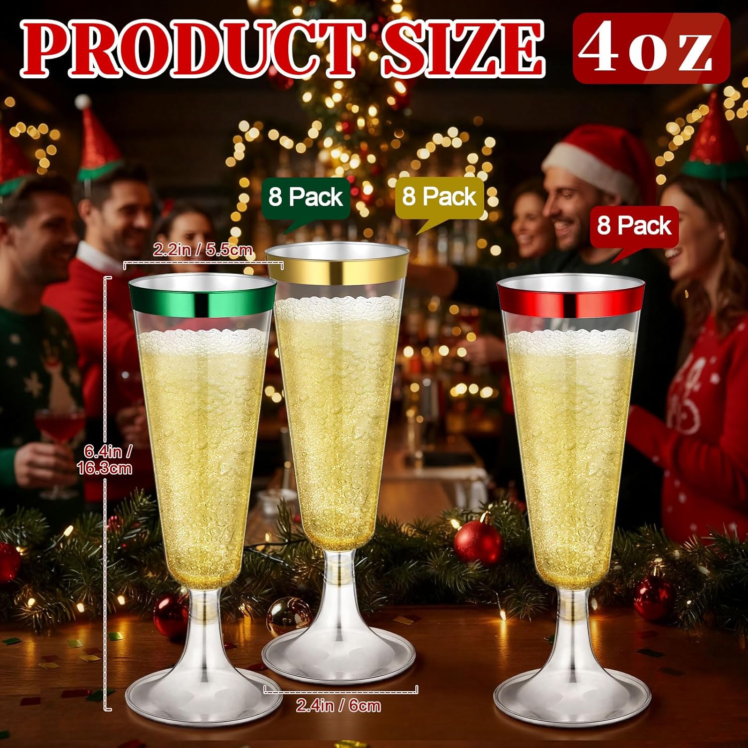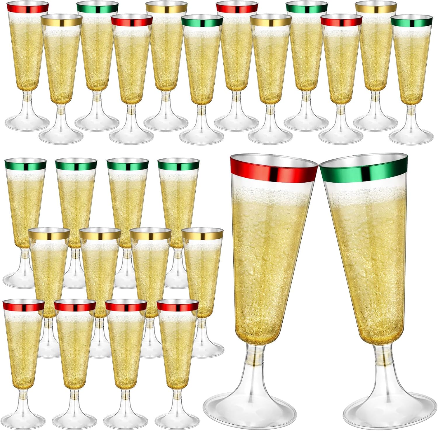 - Package Includes: 24 hard plastic champagne flutes in four colors: red, green, and gold, 8 of each, holding approximately 4 ounces; These champagne flutes are not only sturdy and practical, but also add a festive touch to your party