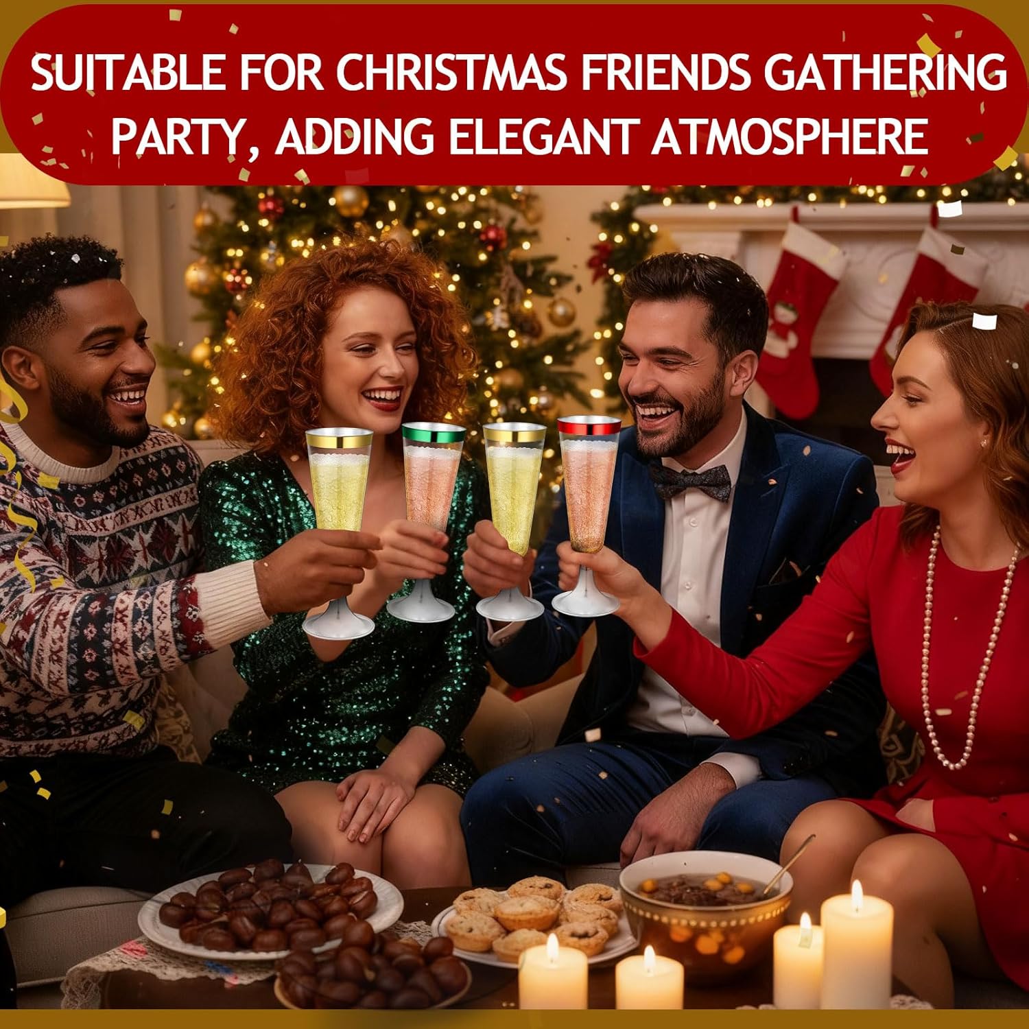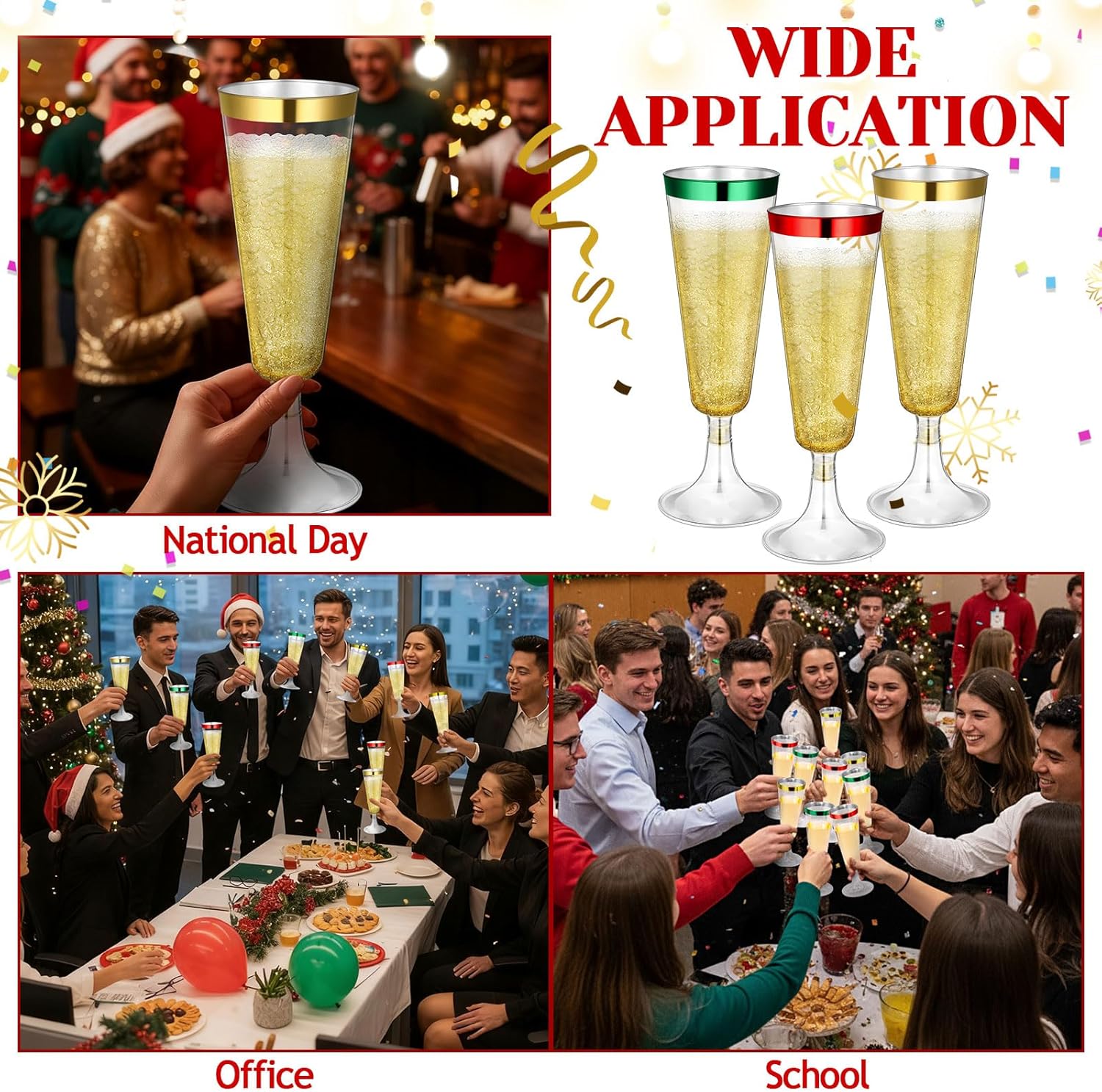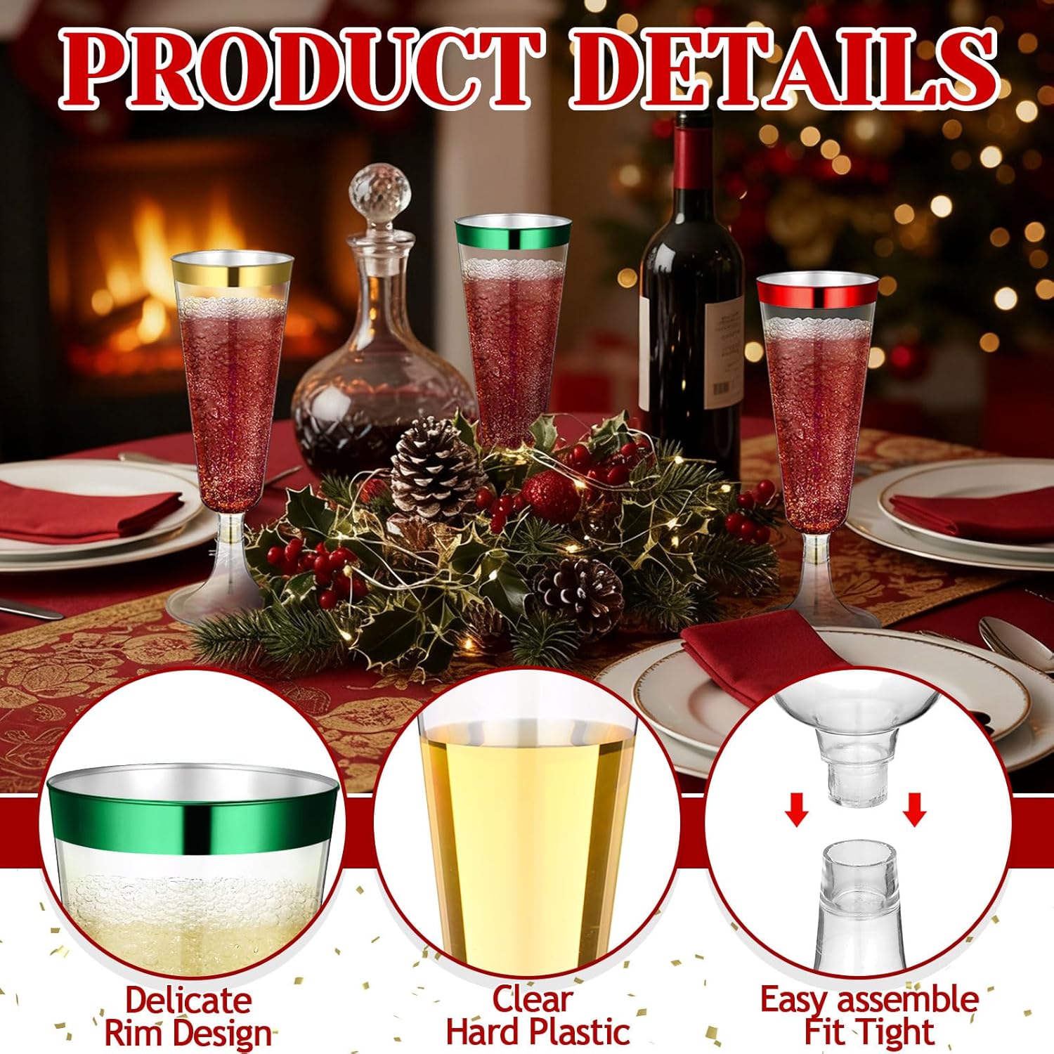 - Shatterproof and Easy to Assemble: the disposable glasses are shatterproof and come in a colorway nice for Christmas-themed events; They are also nice: for crowded parties or venues with limited space, allowing you to fully enjoy the festive atmosphere; The two halves of the disposable champagne flutes are also easy to assemble and fit snugly, so you don’t have to worry about the base coming off the cup during use; The two-piece design makes it easy to store after the party