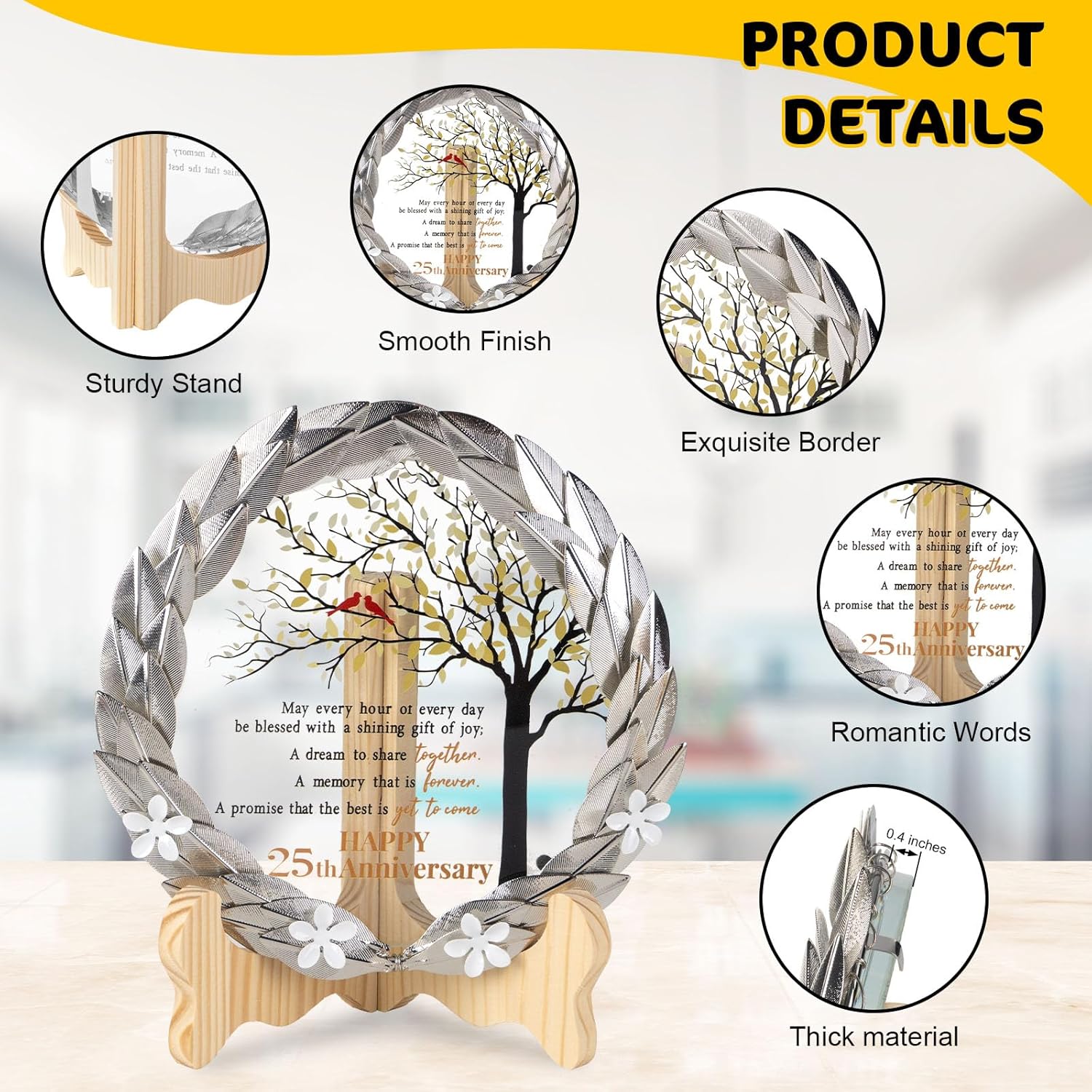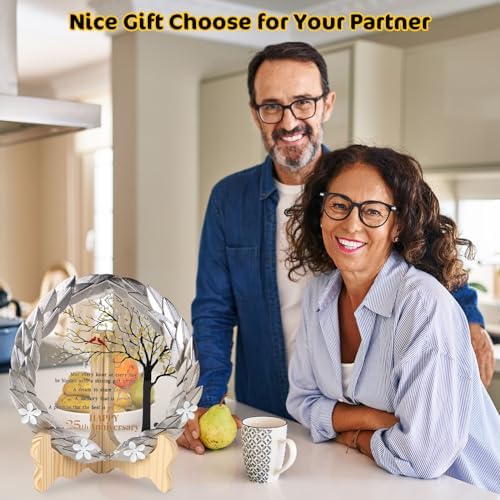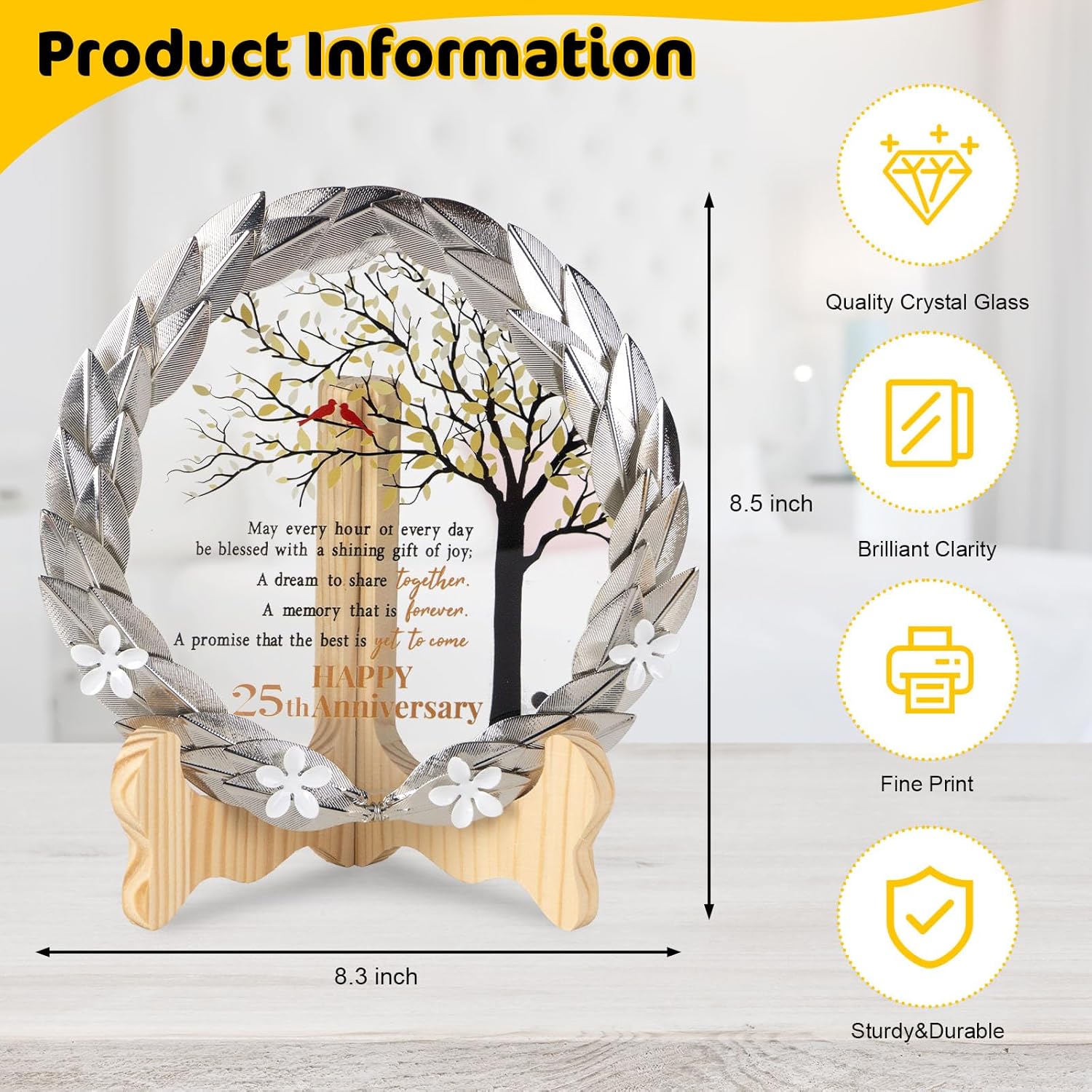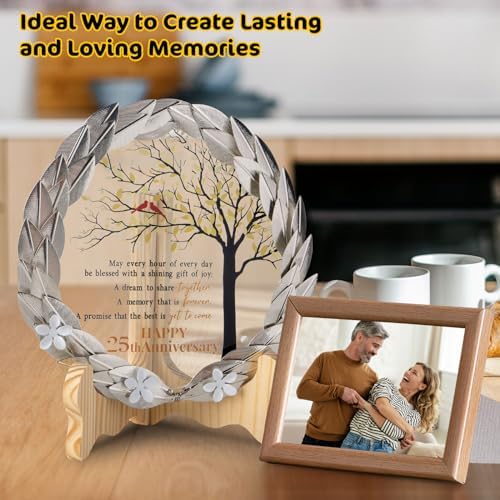 - Exquisite Craftsmanship – Meticulously crafted with exquisite craftsmanship, our gilded metal wreath encases a crystal plaque. The crystal disc elegantly showcases a heartfelt message, symbolizing the enduring bond of 25 years together.