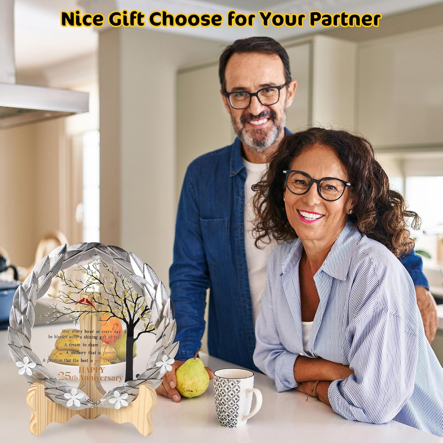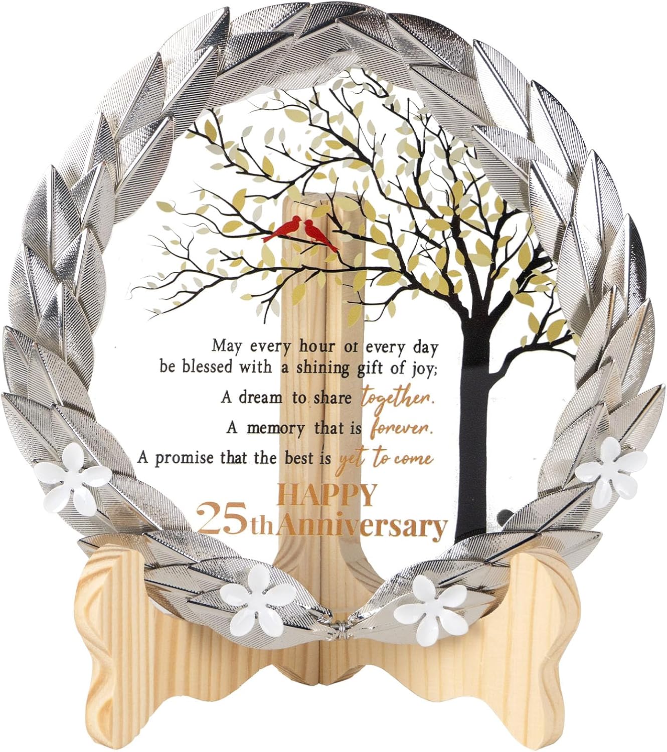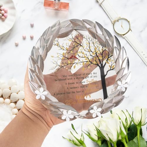 - Timeless Treasure – This timeless treasure, featuring a golden metal wreath and crystal plaque, is the perfect gift to celebrate a 25th wedding anniversary. Delight the lucky couple with this meticulously crafted and beautifully packaged tribute.