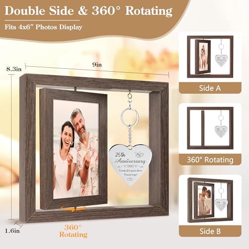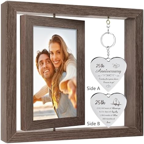 - 25th Wedding Anniversary Decorations:Every element is designed to honor their story.The solid wood frame, with its warm vintage grain and 360-degree rotation,allowing the couple to display two cherished photos.The two-sided heart pendant adds a layer of sentiment, while the included 25th anniversary card provides the perfect space for tyour heartfelt message.It serves as the perfect 25th anniversary decorations for a bookshelf, desk, or any cherished corner of the home.