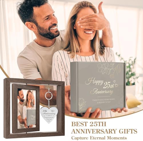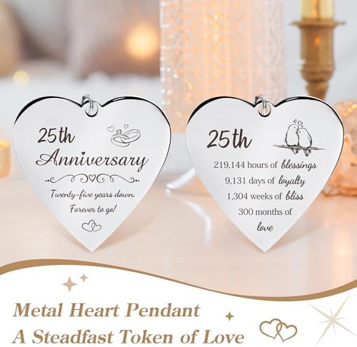- This curated 25 year anniversary gifts for couple set includes 3 items to make the occasion special: 1* premium wooden picture frame adorned with a delicate stainless steel heart pendant, 1* blank 25th anniversary card for personal messages, all presented in 1* elegant keepsake box. Thoughtfully assembled, each element reflects the beauty of lasting commitment—a ready-to-gift tribute for the couple celebrating this silver milestone.