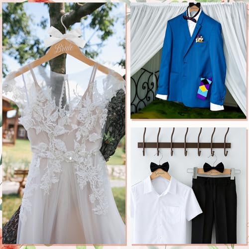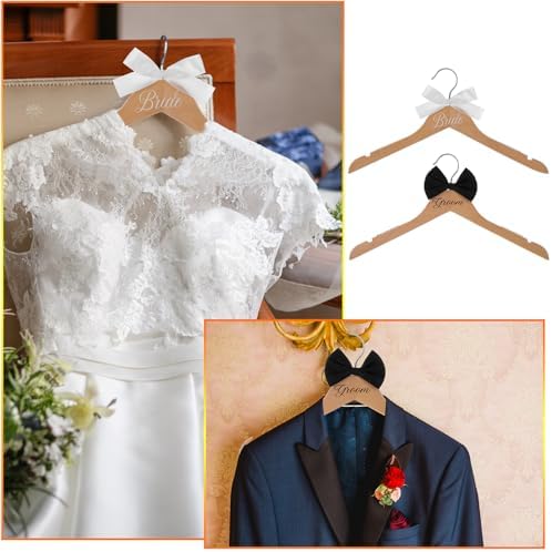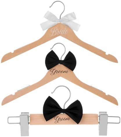- Exquisite Details: the three hangers are engraved with “bride” and “groom” and the wood color wedding dress hanger come with a white colored bow, with the groom hanger featuring a black colored bow tie, which make ceremonial for bride and groom to receive their cloth; The useful notches for dress straps and the trouser clips for pants hanging are included, making it convenient to hang many wedding attire; Exquisite detail not only present a visually stunning product, but also meet practical need