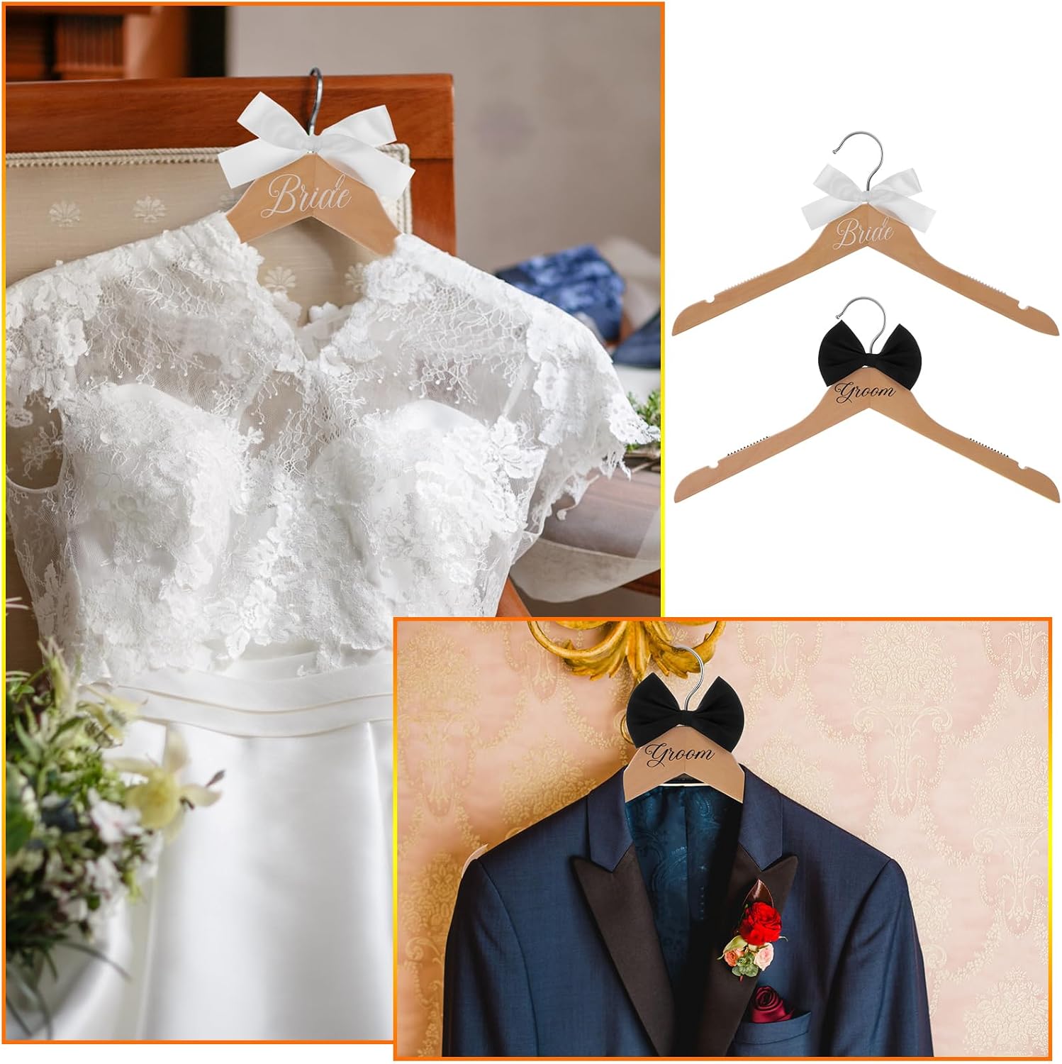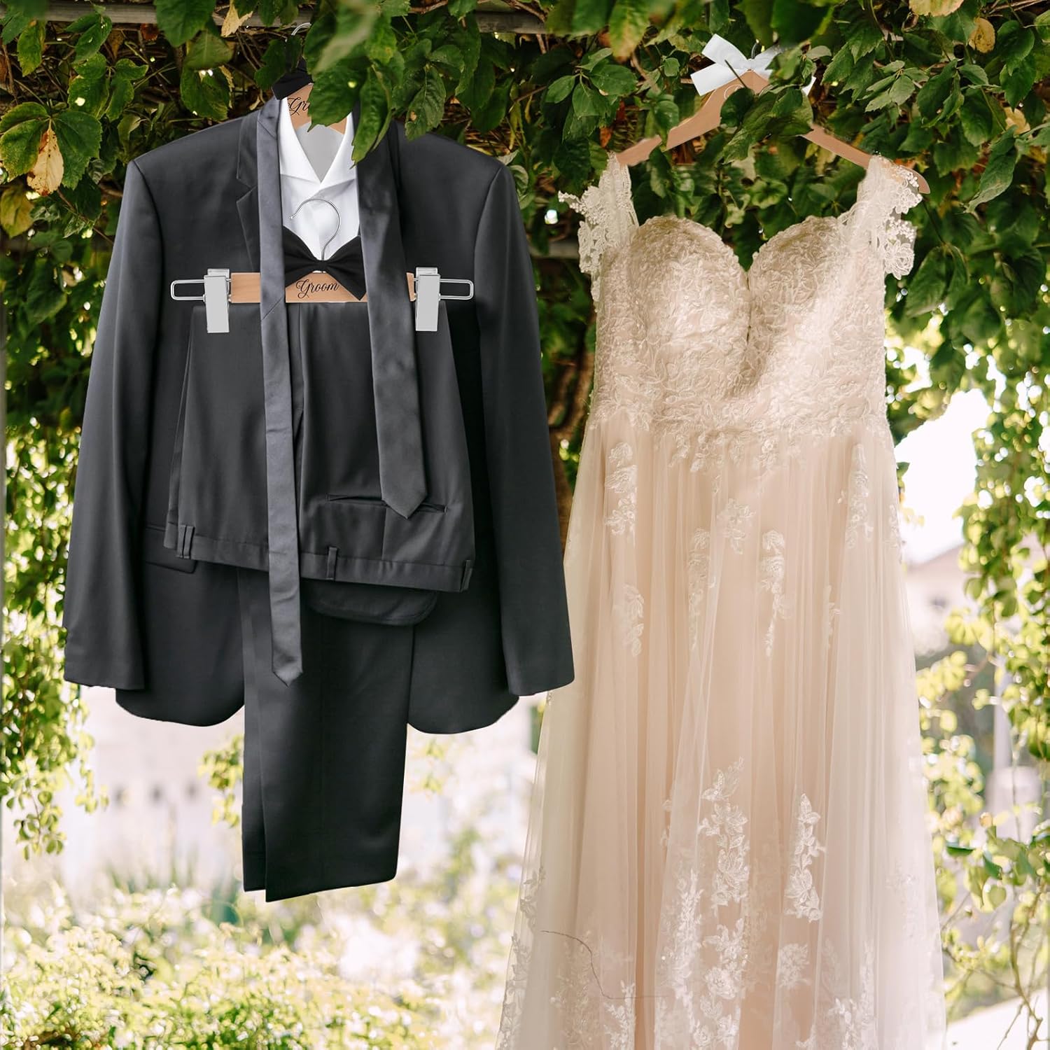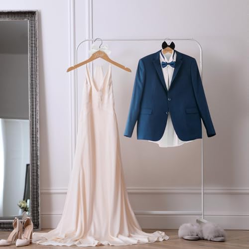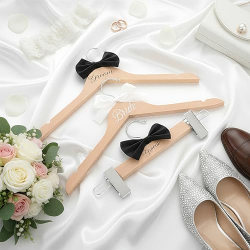 - Complete Set for Bridal and Groom: includes 1 harmonious bride hanger, 1 groom hanger, and 1 hanger with trouser clips; In traditional wedding colors, the wedding dress hangers set can add sophistication and elegance to wedding preparations
