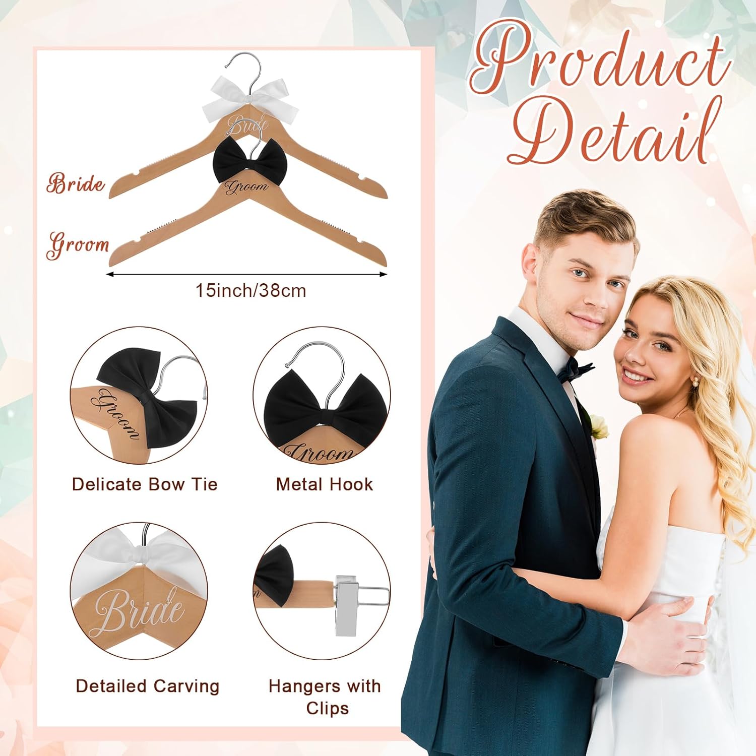 Features: Enhance the charm of the bridal attire by elegantly displaying your wedding dress with wooden hangers. The combination of polished wood and shiny metal adds an air of sophistication to your wedding attire. The groom’s tuxedo or suit hanger embodies masculine elegance. It displays the groom’s attire in a stylish and attractive way, becoming an essential part of your wedding. Specifications: Material: wood, metal iron Color: white, black, wood color, silver Size: about 15 inch/ 38 cm Package includes: 1 x Bride dress hanger 1 x Groom dress hanger 1 x Hanger with clip Notes: Manual measurement, please allow slight errors on size. The color may exist a slight difference due to different screen displays