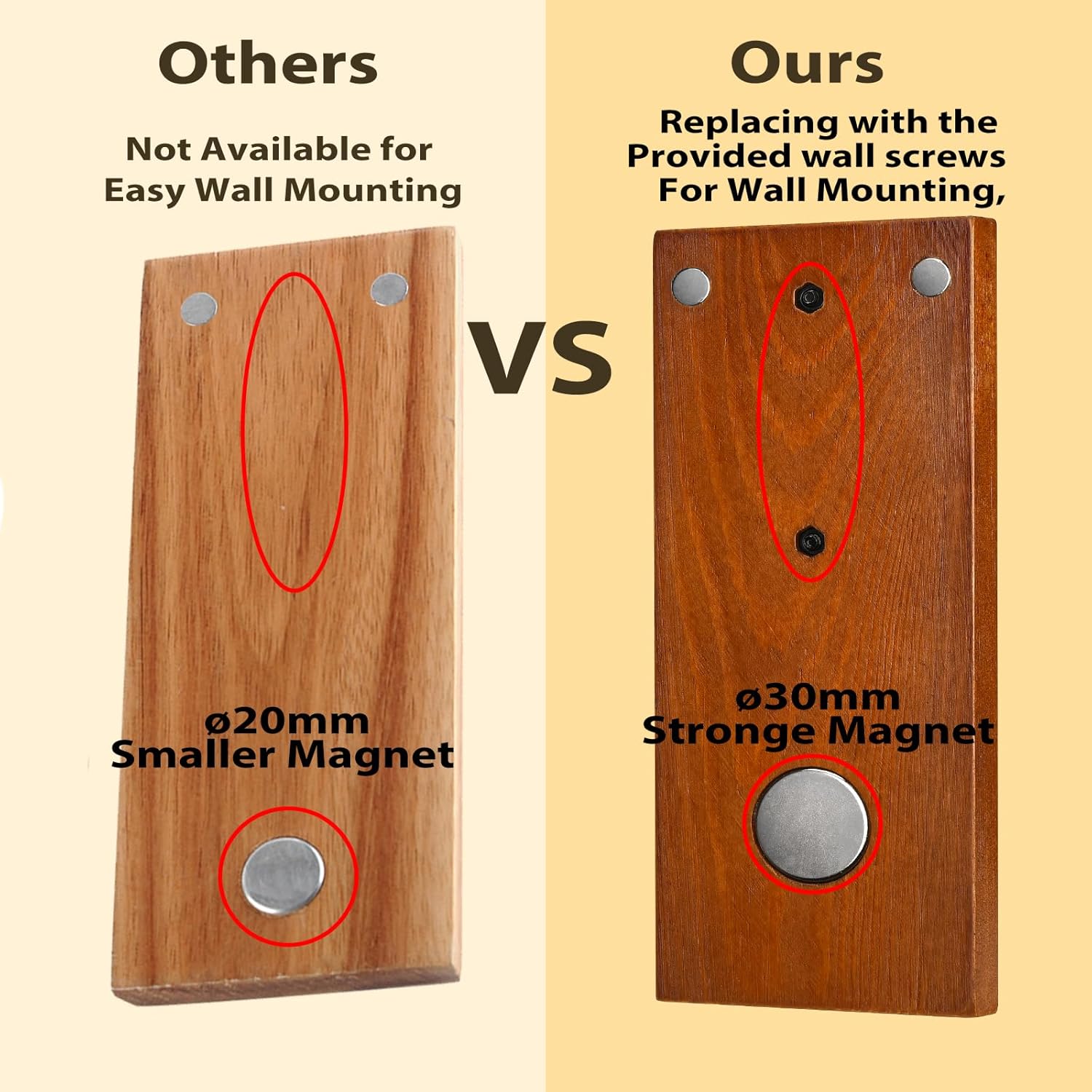 • To mount, simply place the catch against a magnetic surface OR remove display screws, and replace with the provided 2″ wall screws.