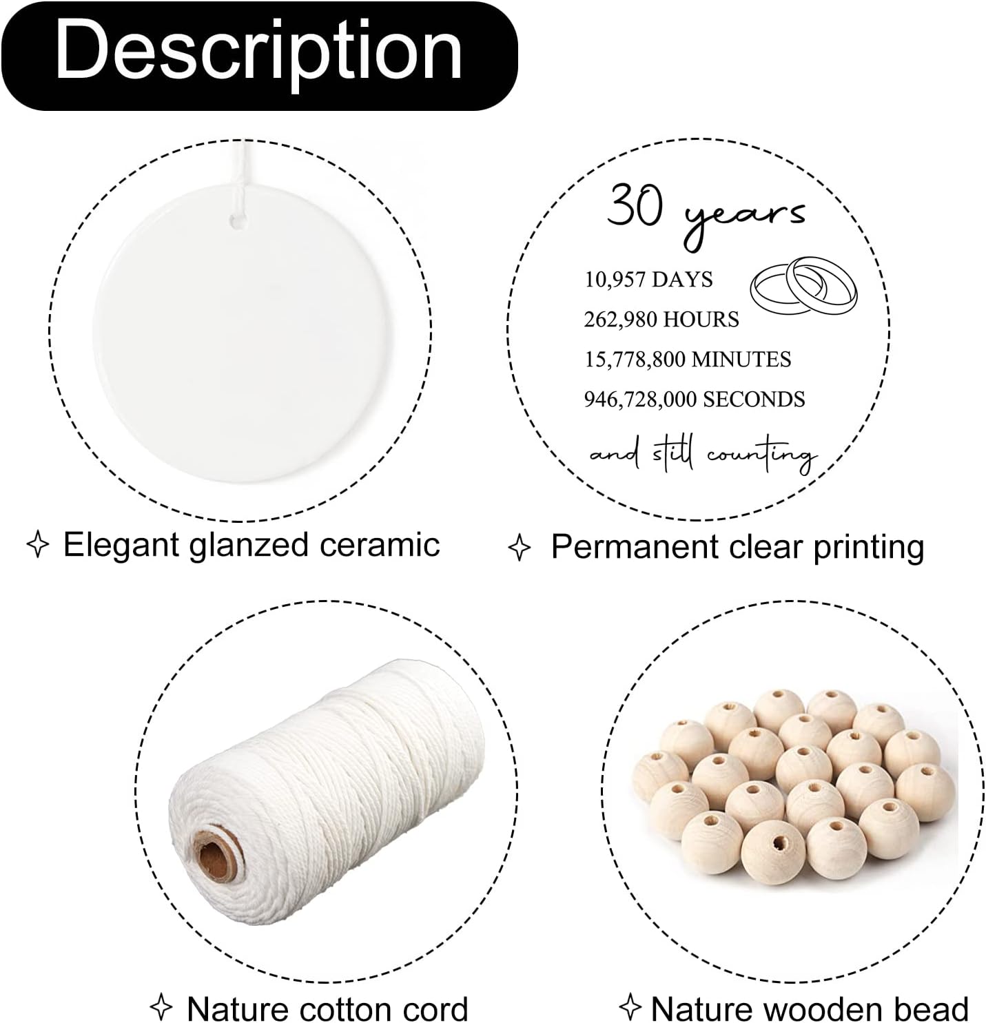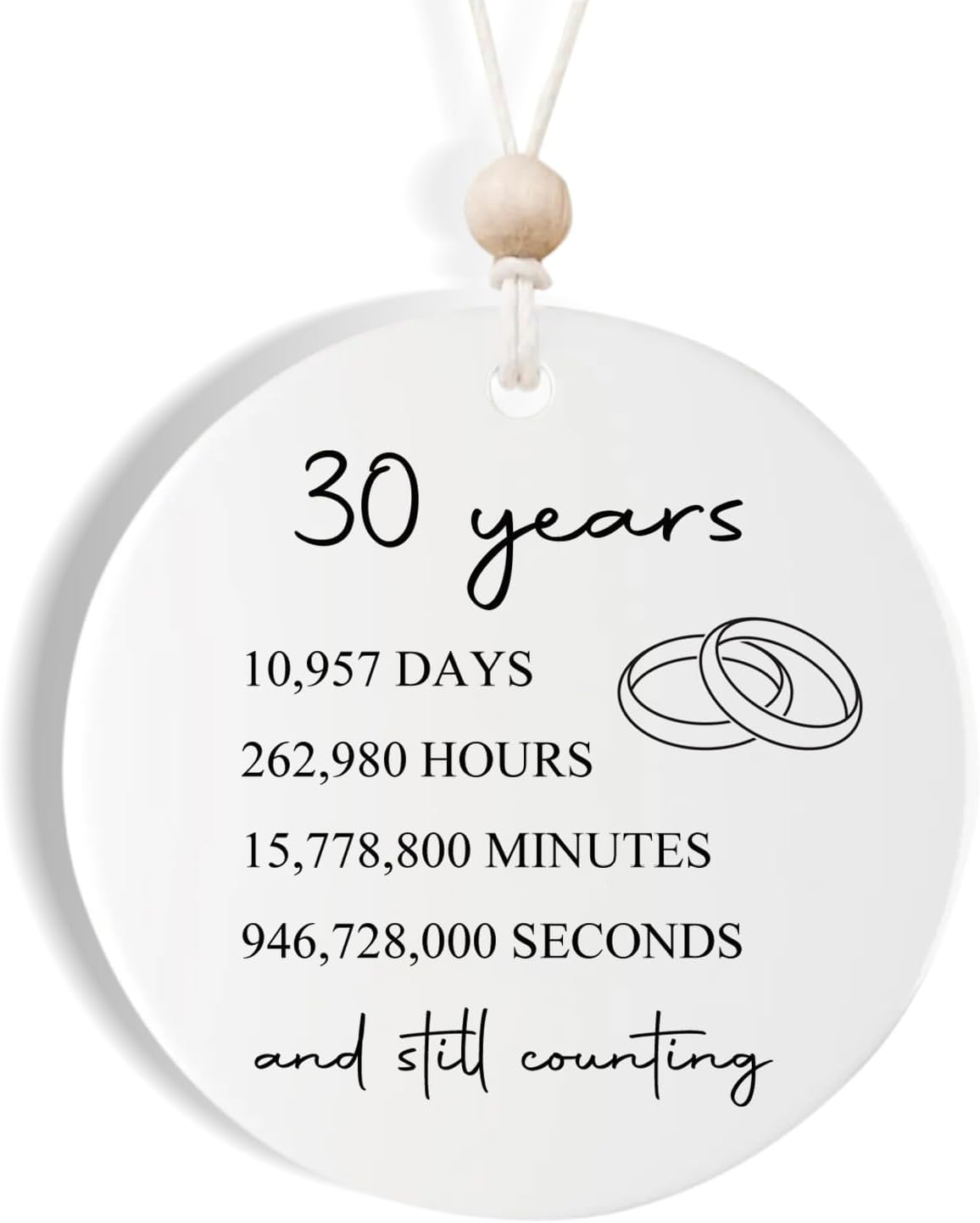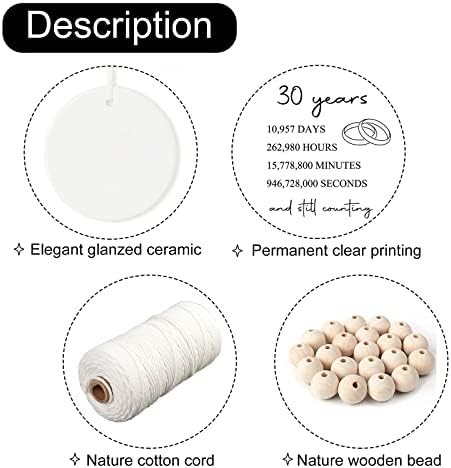 - Product details: Made of premium white ceramic with a flawless glossy glaze, diameter 2.87 inches, printed with: 30 years, 10,957 days, 262,980 hours, 15,778,800 minutes, 946,728,000 seconds and still counting