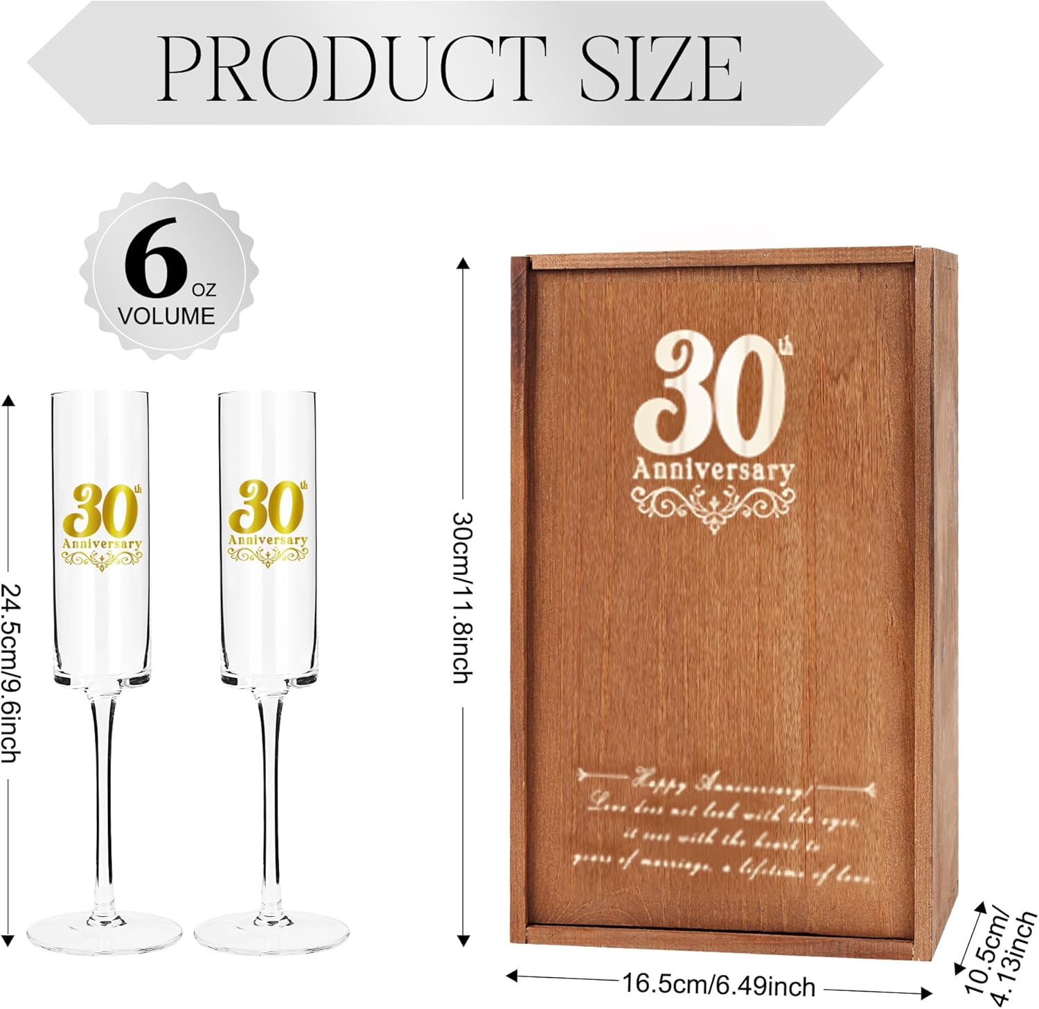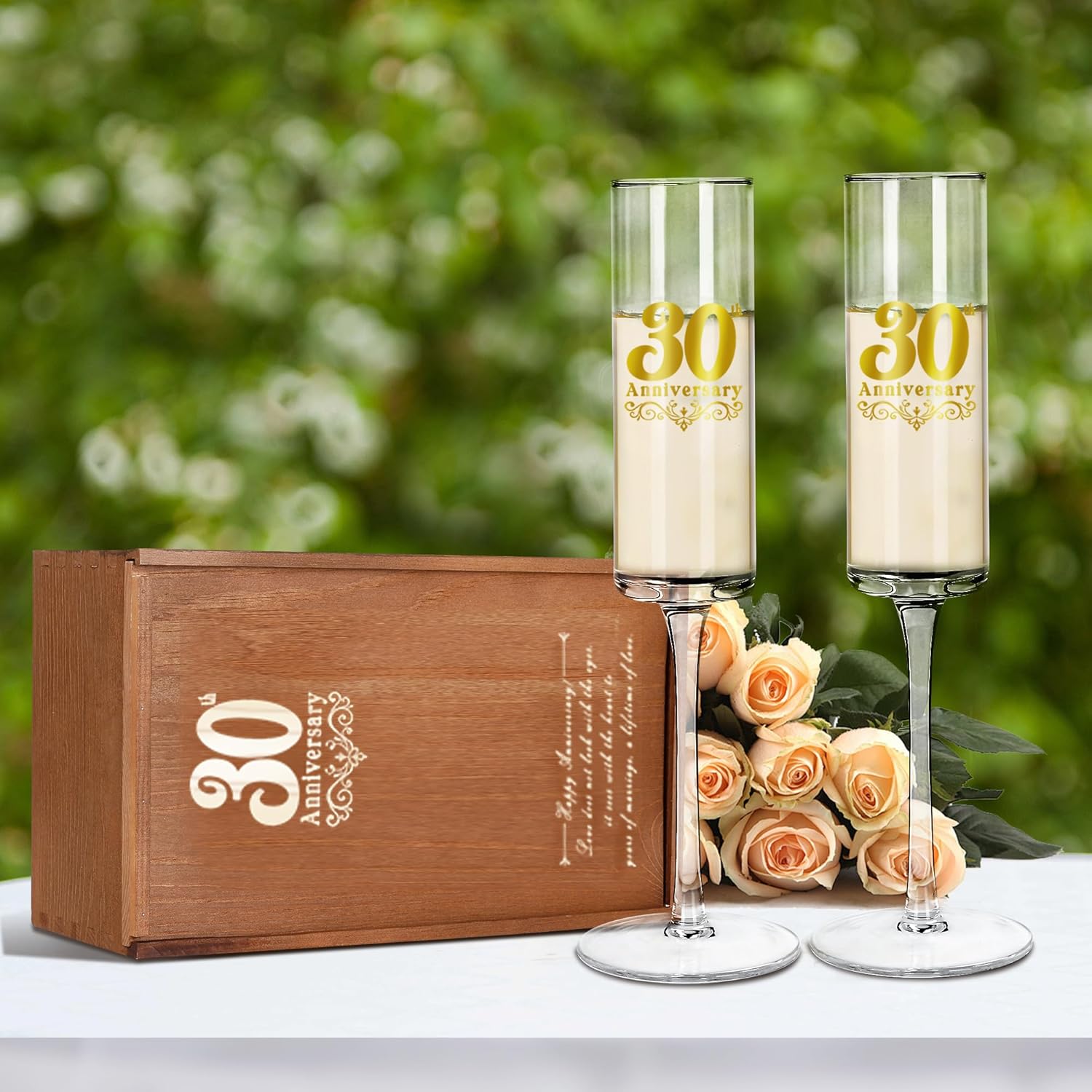 - Unique Keepsake: Both the champagne flutes and the wooden box are engraved with the 30th Anniversary inscription, offering a touch of elegance and sophistication. The wooden box can also be used as a storage box for photos or jewelry. This is the perfect way to commemorate 30 years of love and memories.