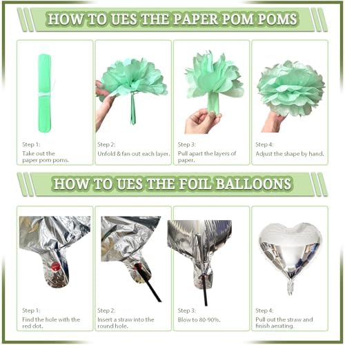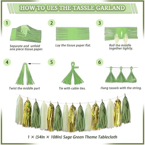 - [Rich Sage Green Themd Party Decor] – Our Kit contains 60 x latex balloons in different colors, 1 x tassel garland(5 x gold, 5 x sage green, 5 x white), 4 x paper pom poms (2 x green, 2 x sage green), 1 x “BRIDE TO BE” foil balloon, 2 x rain curtains, 4 x eucalyptus leaves, 1 x Ribbon, 1 x balloon strip, will decorate a memorable bachelorette party for you!