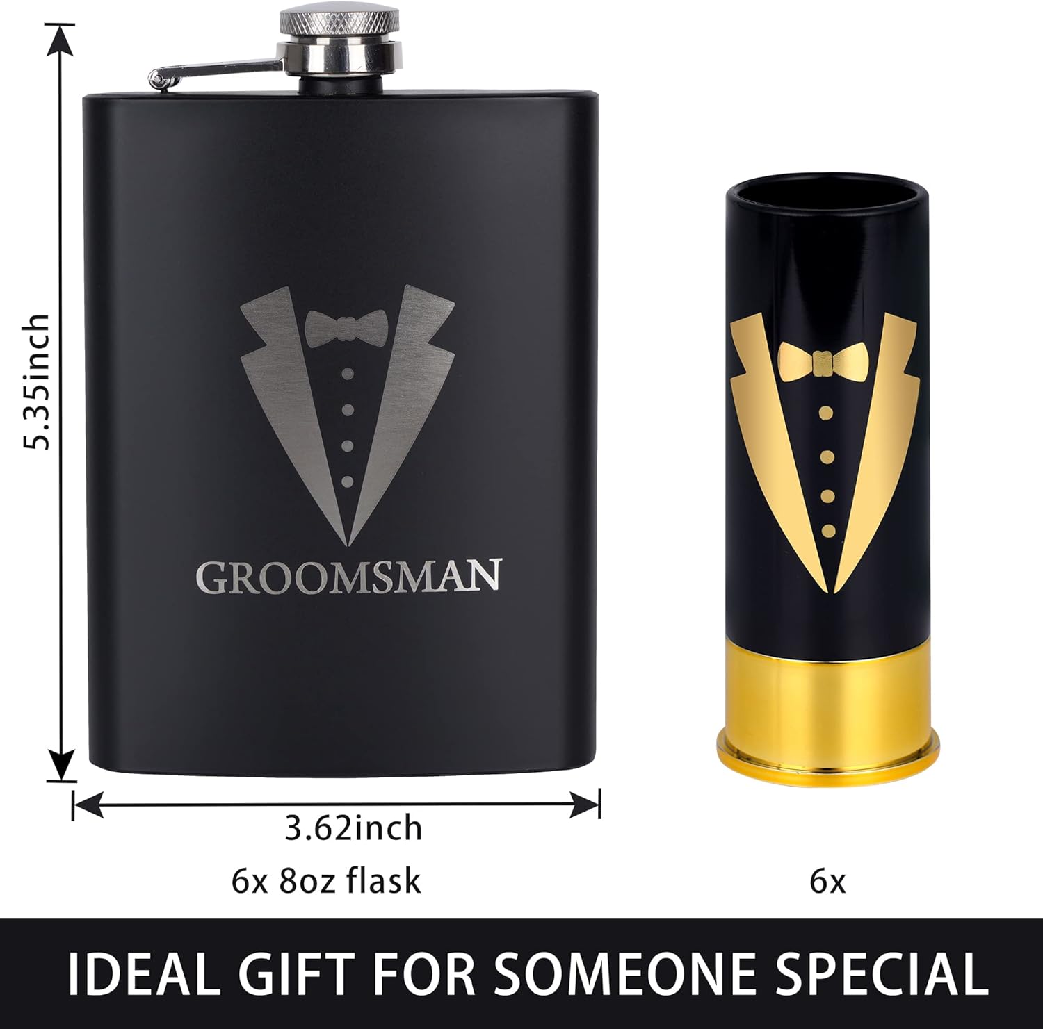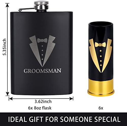 - Flask and shot glass: these groomsmen are printed with tuxedo patterns in classic black, white and golden, the groomsmen flask for wedding also texted with words and more,the groomsmen flasks around 13.8 x 9.2 cm / 5.4 x 3.6 inches,the wine glasses measure approx. 9 x 3 cm / 3.5 x 1.2 inches,about 8 oz