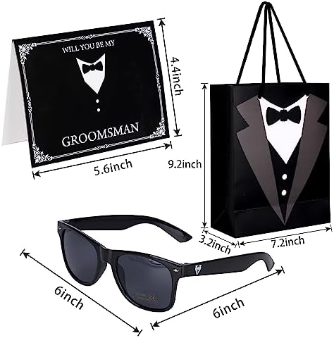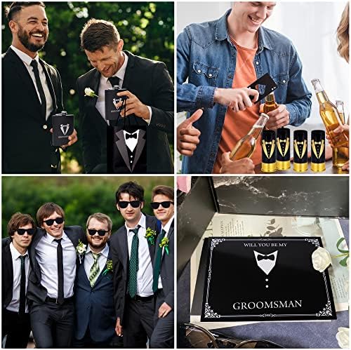 Groomsmen Gifts Set: the package contains 6 pieces flasks in 8 oz(1 groom ,1 bestman,4 groomsman), 6 pieces poker bottle cap opener,6 pieces gauge glasses,6 pieces sunglasses(1 groom ,1 bestman,4 groomsman), 5 pieces card(1 bestman,4 groomsman), 6 pieces of gift bags,35 pieces in total ,ideal gifts for groomsmen in weddings Flask and shot glass: these groomsmen are printed with tuxedo patterns in classic black, white and golden, the groomsmen flask for wedding also texted with words and more,the groomsmen flasks around 13.8 x 9.2 cm / 5.4 x 3.6 inches,the wine glasses measure approx. 9 x 3 cm / 3.5 x 1.2 inches,about 8 oz Bottle opener and sunglass:the bottle openers are designed with vivid poker in the shape of ace of spades, attractive for your party, the credit card size bottle openers measure about 8.6 x 5.5 cm / 3.4 x 2.2 inches.These sunglasses are specifically designed to help you add more glamour of the grooms big night and makes for fabulous photo accessories making these a must have for any event,they are made using high quality, durable and eco-friendly material to provide you long term use. After youre done having a night of fun, you can use these like fabulous everyday glasses Groomsman card and gift box:4pcs “WILL YOU BE MY GROOMSMEN ” cards and 1pc “WILL YOU BE MY BEST MAN” cards, which is a fun and classy way to ask your groomsmen to be part of your wedding while flaunting your sense of humor, adding more fun to the process of preparing for your wedding.These premium bags exude a pricey feel,Each gift bag measures approximately 7.5 x 9,show them youre classy with these medium sized tuxedo gift bags Wide Application: the groomsmen men wedding sets can be applied for various occasions, like weddings, engagements, bachelor parties to groomsmen, father of the bride, ushers, the groom, or any special men attending the wedding, also suitable for daily use such as birthday, anniversary, proms, picnics, etc