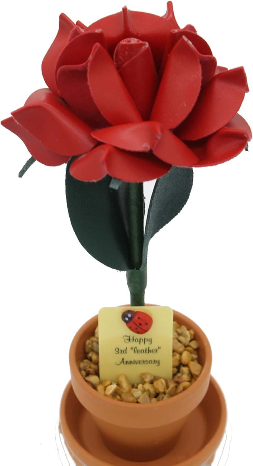 The JustPaperRoses 3rd Year Wedding Anniversary Rose is a handcrafted artificial flower made from faux leather. It stands approximately 7 inches tall and comes in a terra cotta pot with decorative pebbles, suitable for home or office display. This item includes a Happy 3rd Leather Anniversary tag and a small decorative ladybug element. Intended as a symbolic representation of the traditional third anniversary gift, the rose is part of a larger collectible series covering major milestone years.