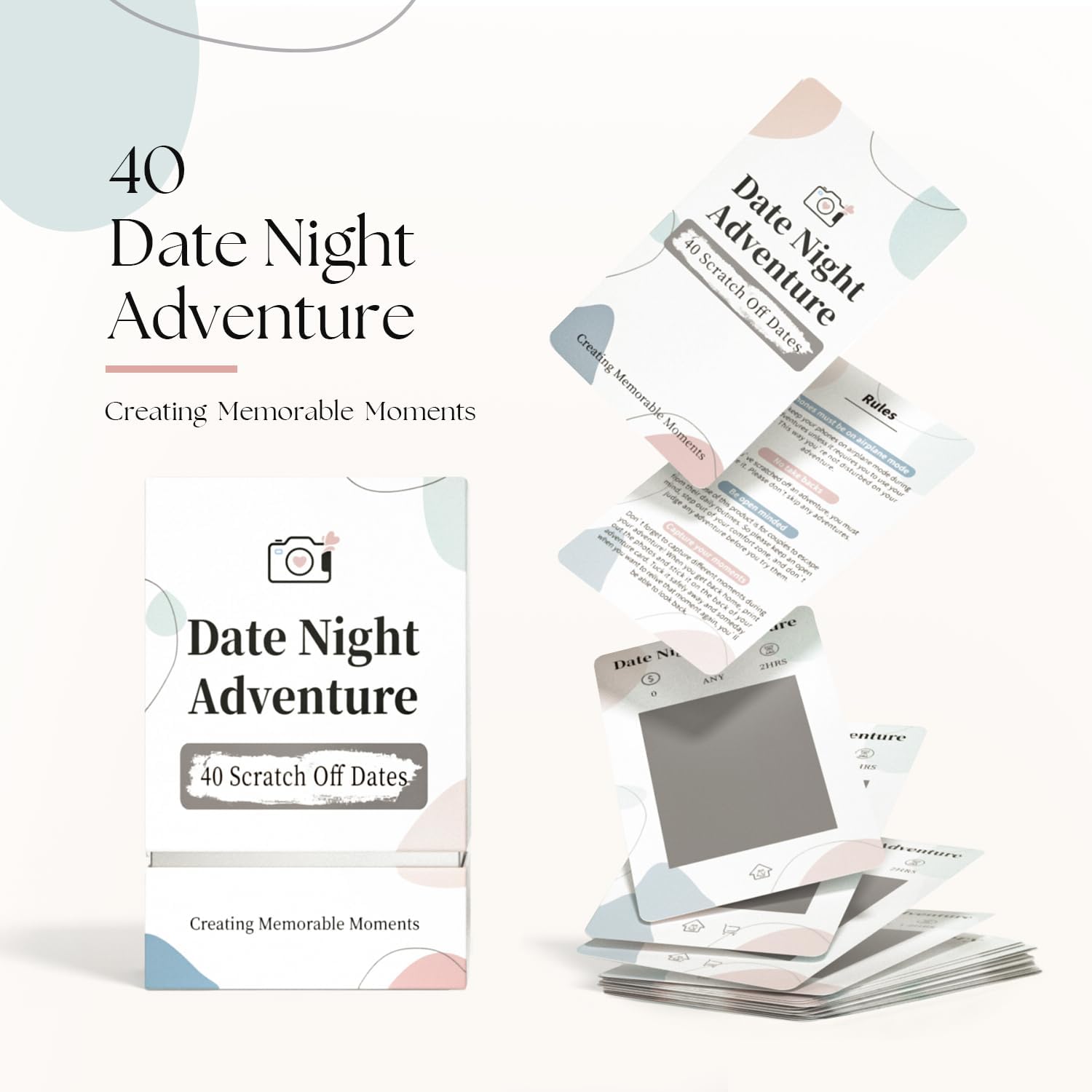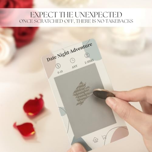 - Scratch Off A Mystery Date Night – 40 unique and creative date night cards for couples turning boring date nights into a thing of the past. Your next date will remain a mystery until you scratch it off and once you scratch off a date card, you must complete it. No takebacks! Are you up for this challenge?