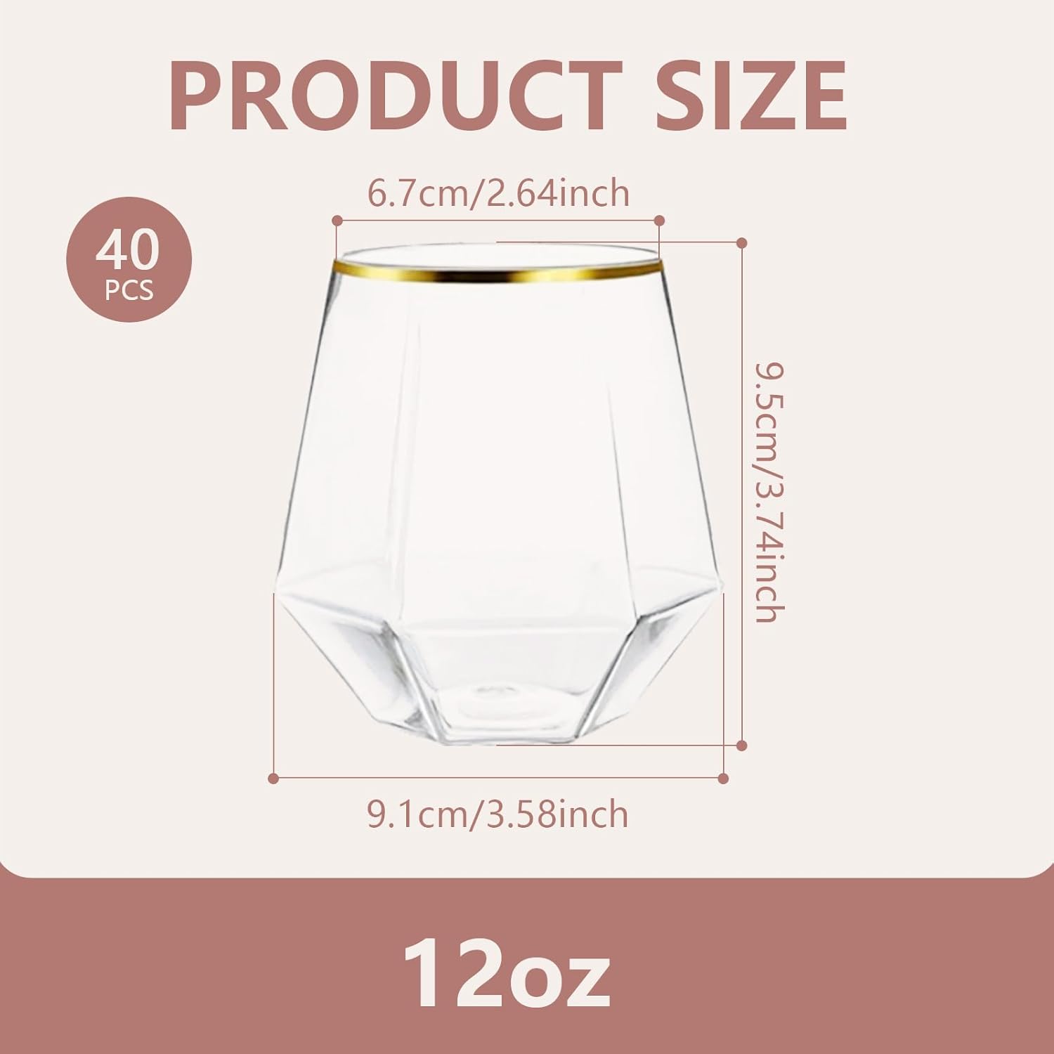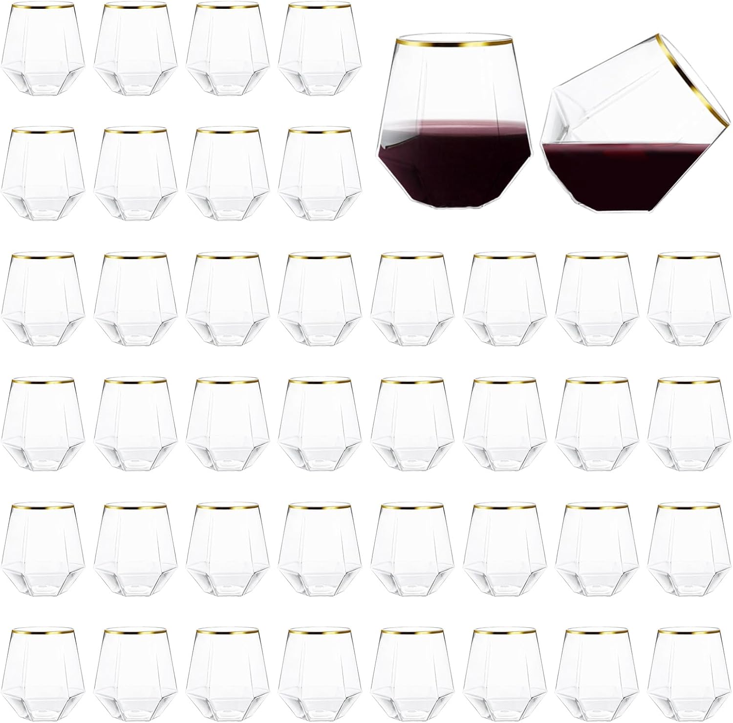 40 Pcs Plastic Wine Cups,12 Oz Gold Rim Plastic Diamond Wine Glass Disposable Stemless Wine Glasses Unbreakable Diamond Wine Glasses for Housewarming Birthday Party Wedding
