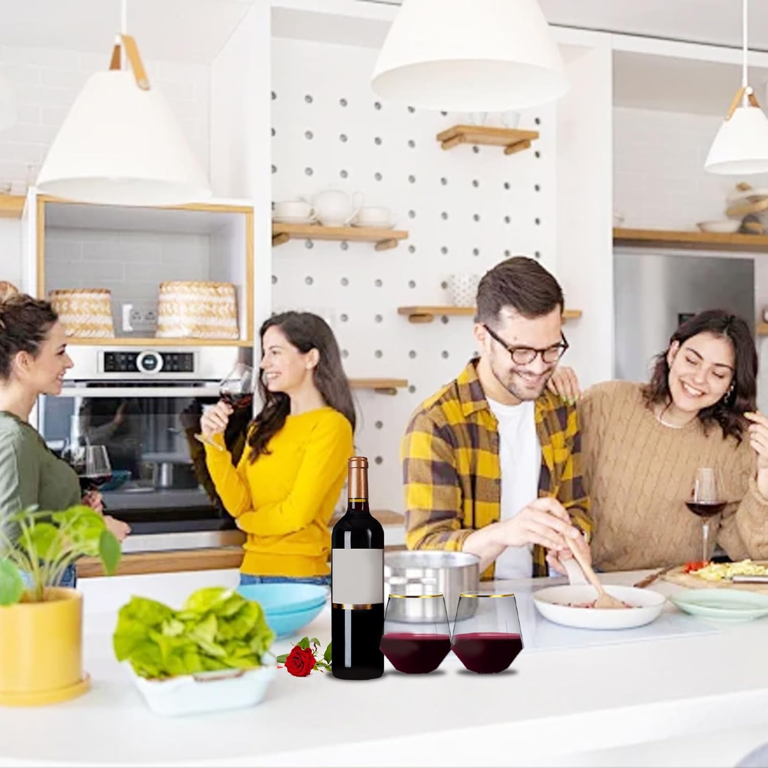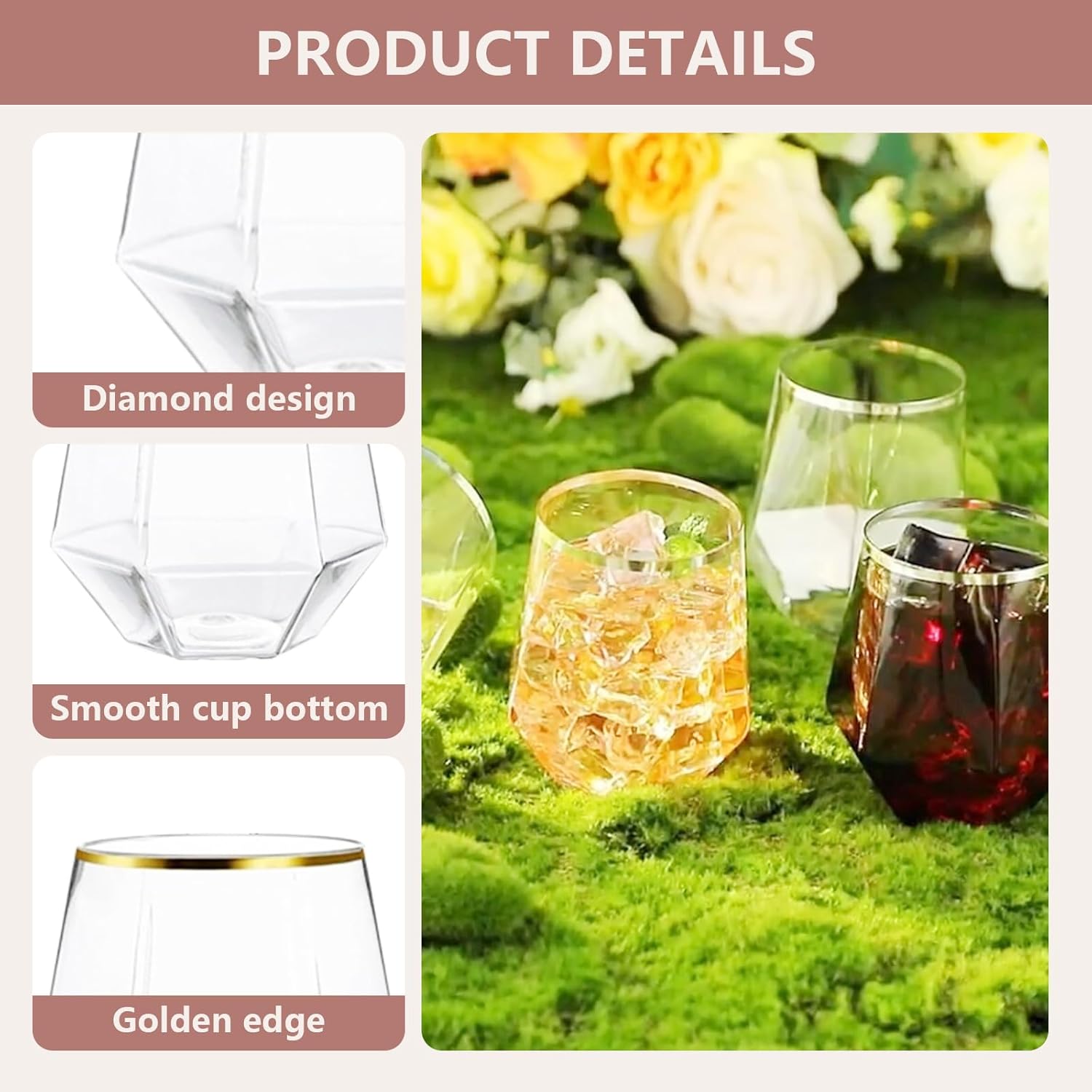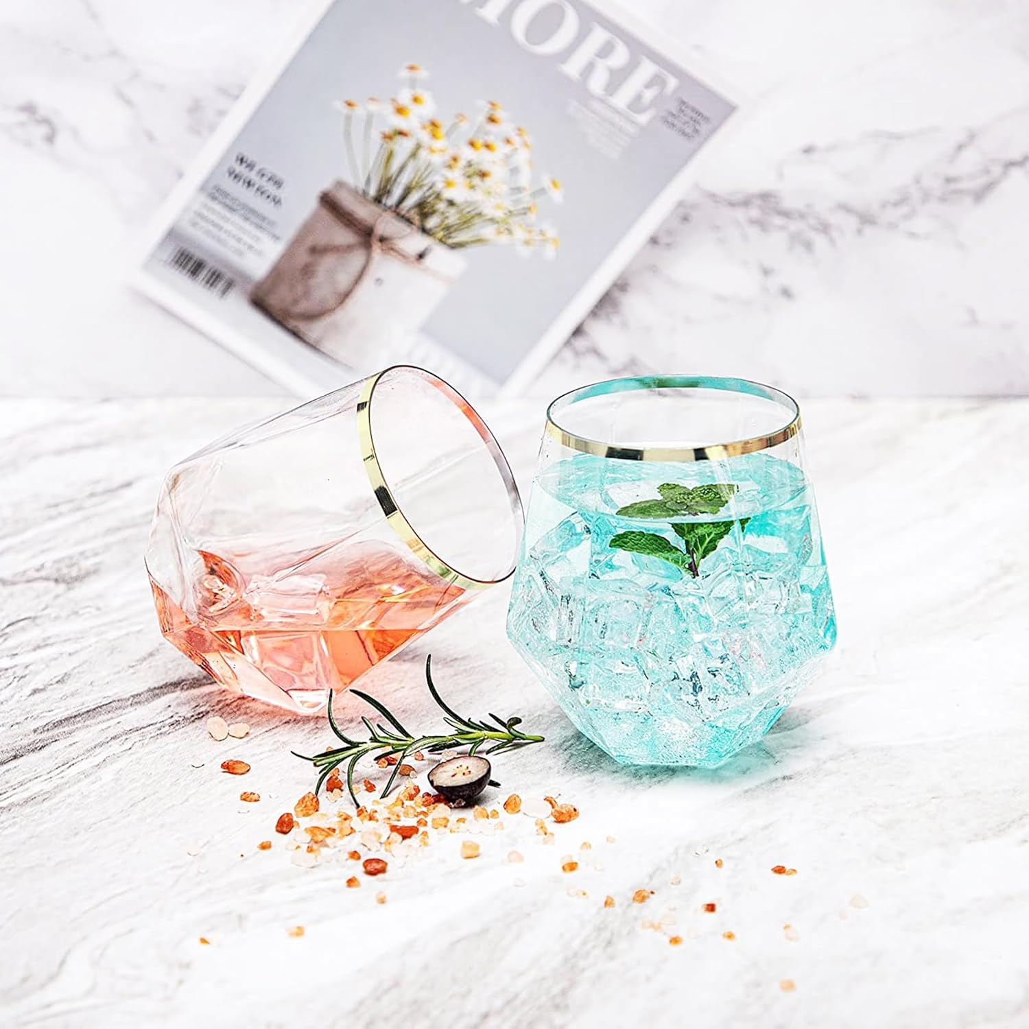 • Diamond and gold edge unique design: The cup body of our disposable stemless wine glasses adopts diamond shape design, not only can you place this diamond shape cups from multiple angles, but you can also easily rotate and tilt it, allowing you to hold it easily. The rim of this plastic wine cup has a golden rim. The stylish design makes this wine cup look more charming and adds a different style to your party.