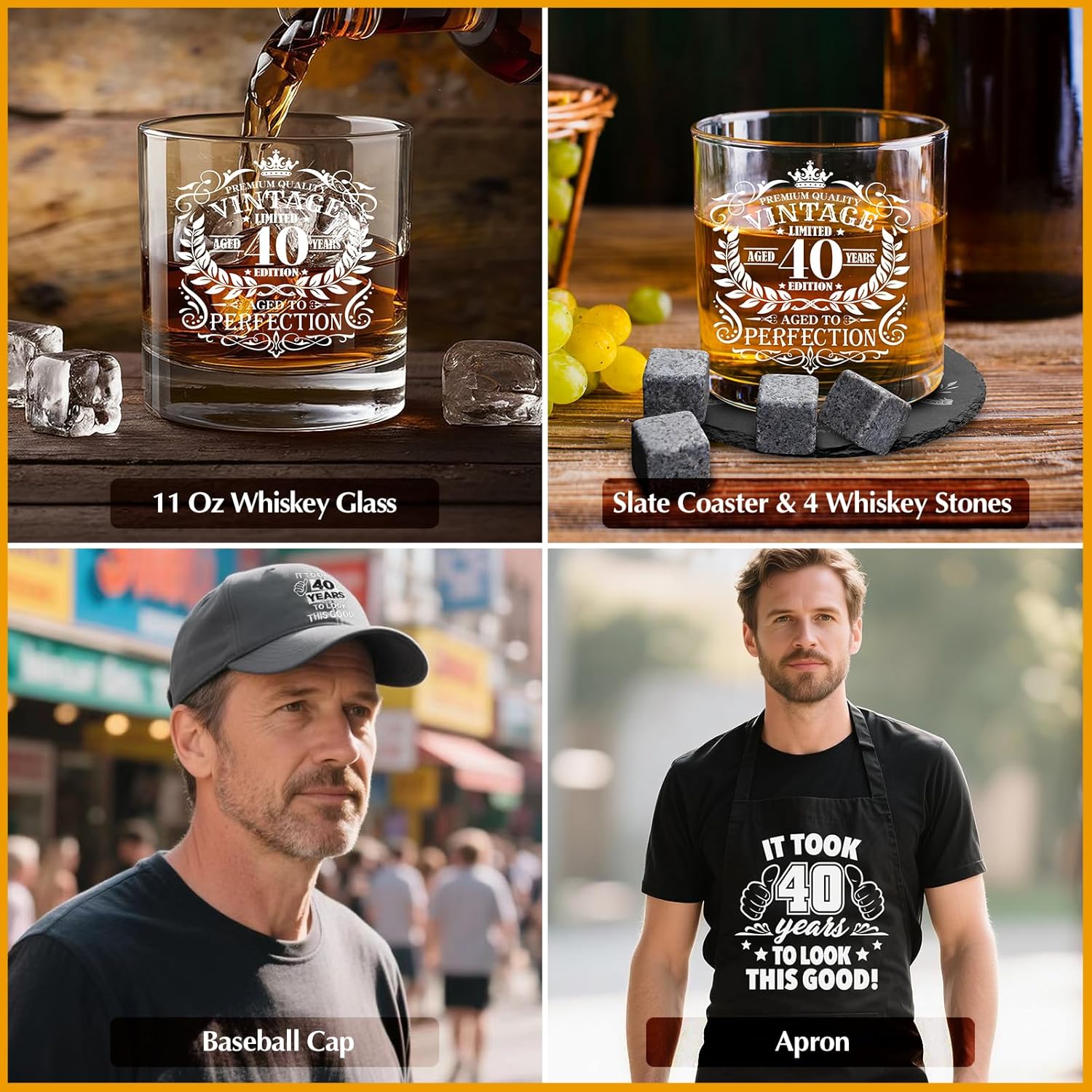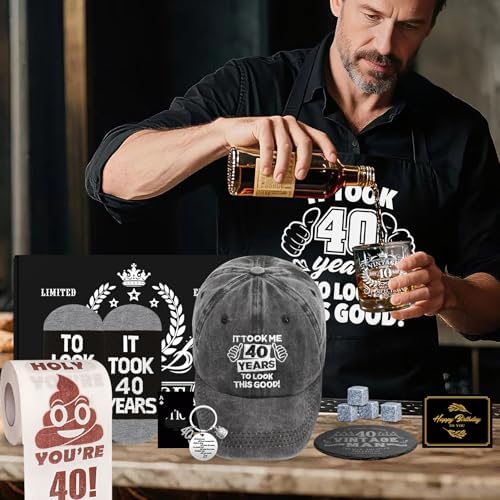- All-in-One 14-Piece 40th Birthday Gift Set for Him: Celebrate a milestone in style with this complete 40th birthday gift set for men! Includes an 11 Oz Whiskey Glass, Slate Coaster, 4 Granite Whiskey Stones, Baseball Cap, Apron, Socks, Toilet Paper, Keychain, Bottle Opener, Greeting Card, Gift Box. Perfectly curated for men who enjoy a mix of humor, sentiment, and everyday functionality. Whether it’s your husband, boyfriend, brother, or coworker, this set delivers birthday cheer with every item