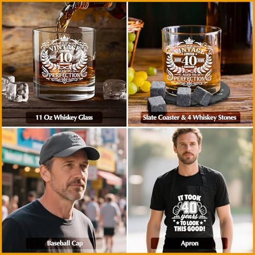 - Premium Whiskey Glass, 4 Stones & Coaster: The 11 oz whiskey glass is made from premium lead-free crystal and features a classic “Vintage – Aged to Perfection – 40 Years” design, making every sip feel like a toast to the journey. Accompanied by a slate coaster and whiskey stones, this trio offers a full whiskey experience. Whether used during a quiet night in or a toast at his birthday party, this drinkware set brings sophistication, functionality, and symbolic meaning to this milestone age