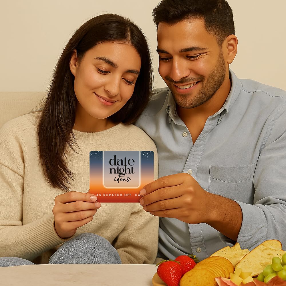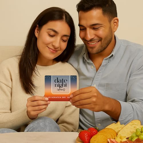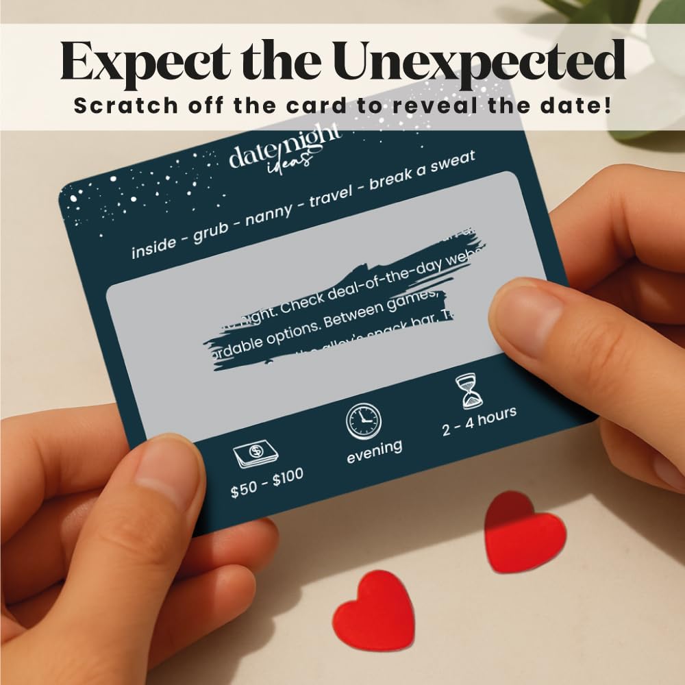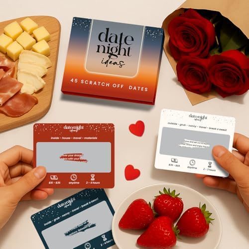 - DATE NIGHT IDEAS: Includes 45 fun date night idea cards and 2 heart shaped coin scratchers. Scratch off a card and begin a unique and unexpected date adventure. Perfect for couples of all ages and engaged / married couples looking for meaningful moments. Great for your anniversary or as a newlywed gift basket.