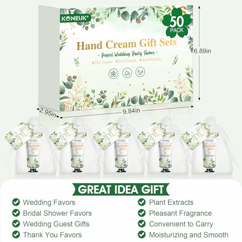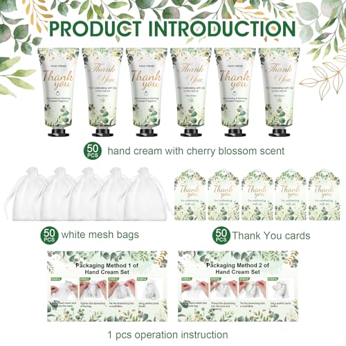 - 【50 Sets Wedding Party Favors】This bridal shower gifts set includes 50pcs hand cream with cherry blossom scent,50pcs thank you tags,50pcs organza gift bags and 1pcs operation instruction.Exquisite and lovely packaging patterns,sufficient in quantity,thank you to the guests who celebrate with you