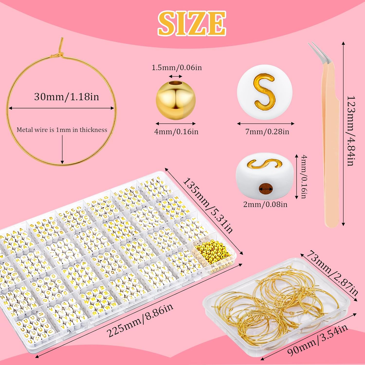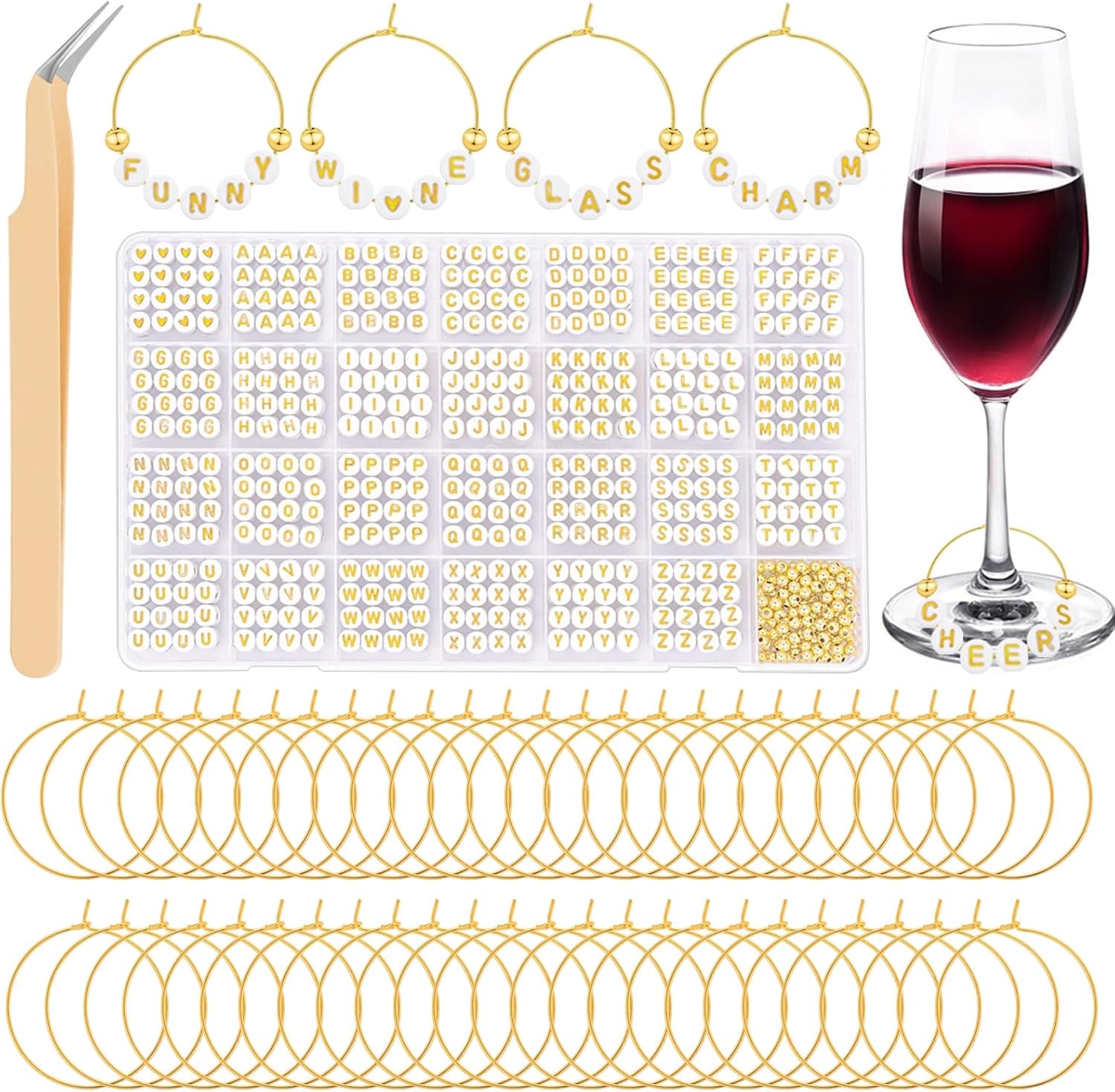 • YOU WILL RECEIVE – This wine glass charms kit is a fun and creative way to personalize your stem glasses. It includes everything you need: 810 white beads (30 pieces of each letter from A to Z and 30 heart beads), 100 smooth gold beads, 50 wine glass charm rings, and 1 tweezer. The pre-sorted wine glass accessories make crafting more convenient and enjoyable.
