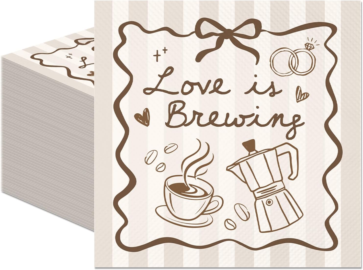 - Unique Design: Each love is brewing napkin features hand-drawn “Love is Brewing” lettering with a coffee cup, coffee beans, moka pot, rings, and heart accents, creating warm love is brewing bridal shower decorations with a romantic coffee feel